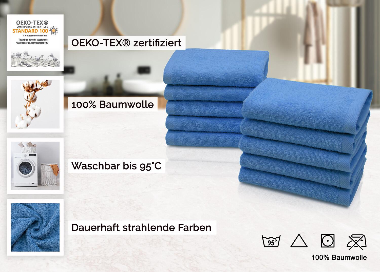 Мыльное полотенце – незаменимый помощник дома и в дороге. Эти небольшие практичные махровые полотенца идеально подходят для снятия макияжа, мытья младенцев и малышей, удаления мыла или геля для душа, а также в качестве гостевого полотенца и освежающего полотенца для вашей сумочки. Практичная вешалка облегчит хранение. Благодаря большому выбору расцветок, наверняка найдется что-то на любой вкус. Мочалки из 100% хлопка плотностью 420 г/м² сотканы в пушистую махровую ткань. Махровая ткань — особенно впитывающая и мягкая разновидность махровой ткани. Дополнительный двойной защитный шов предотвращает растирание. Благодаря окраске индантреном долговечные ткани можно стирать при температуре до 95°C и сушить в стиральной машине, не теряя при этом цвета. Практичный набор из 10 штук синего цвета.