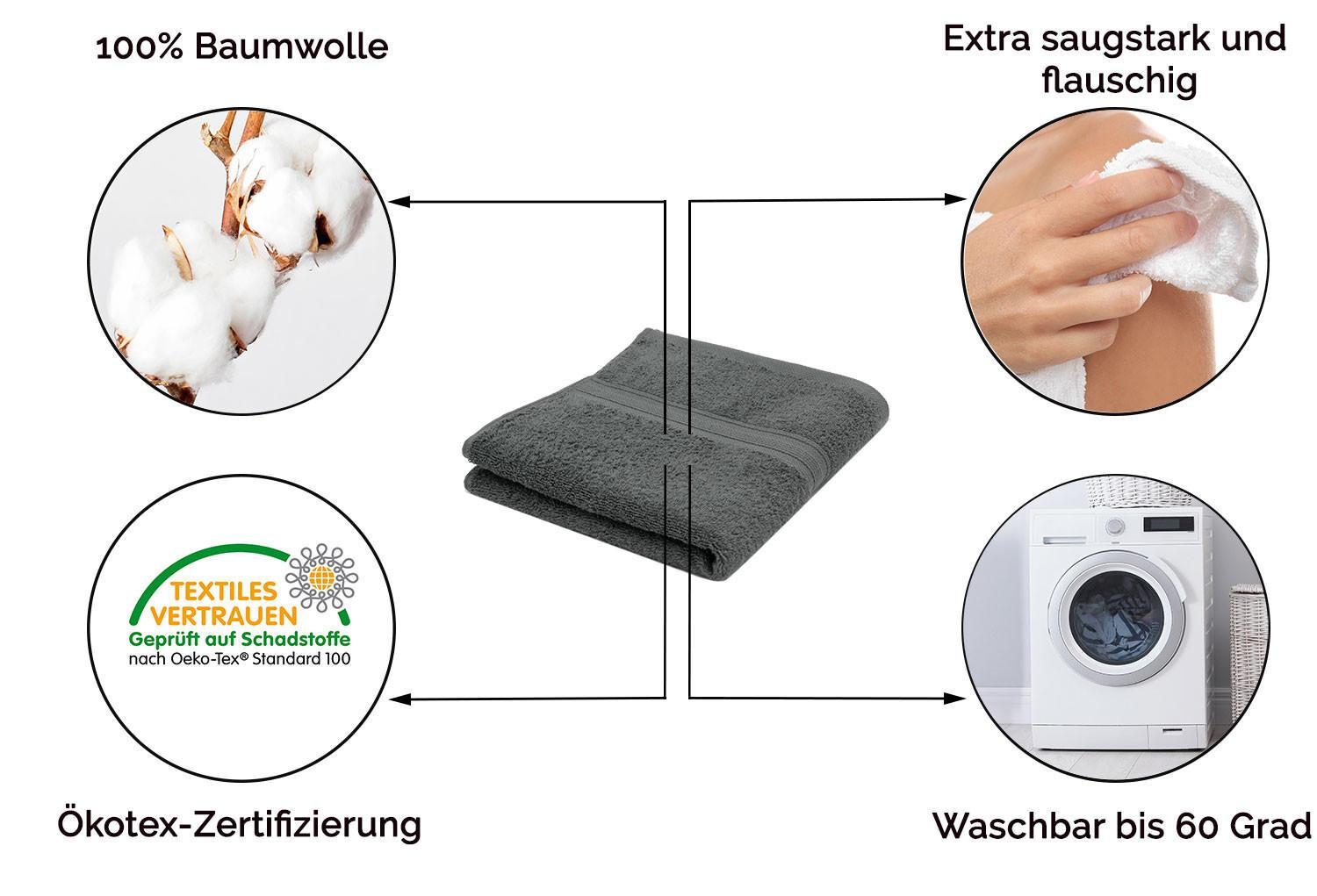 Элегантный комплект махровых полотенец размером 50х100 см изготовлен из 100% хлопка. Красивая тканая кайма дополняет полотенца и привлекает внимание. Это махровое полотенце плотностью около 500 г/м². особенно мягкий и приятный - вы будете в восторге. Чтобы полотенца всегда можно было повесить, необходима подходящая вешалка. Он пришит по короткой стороне и сочетается по цвету с полотенцем.