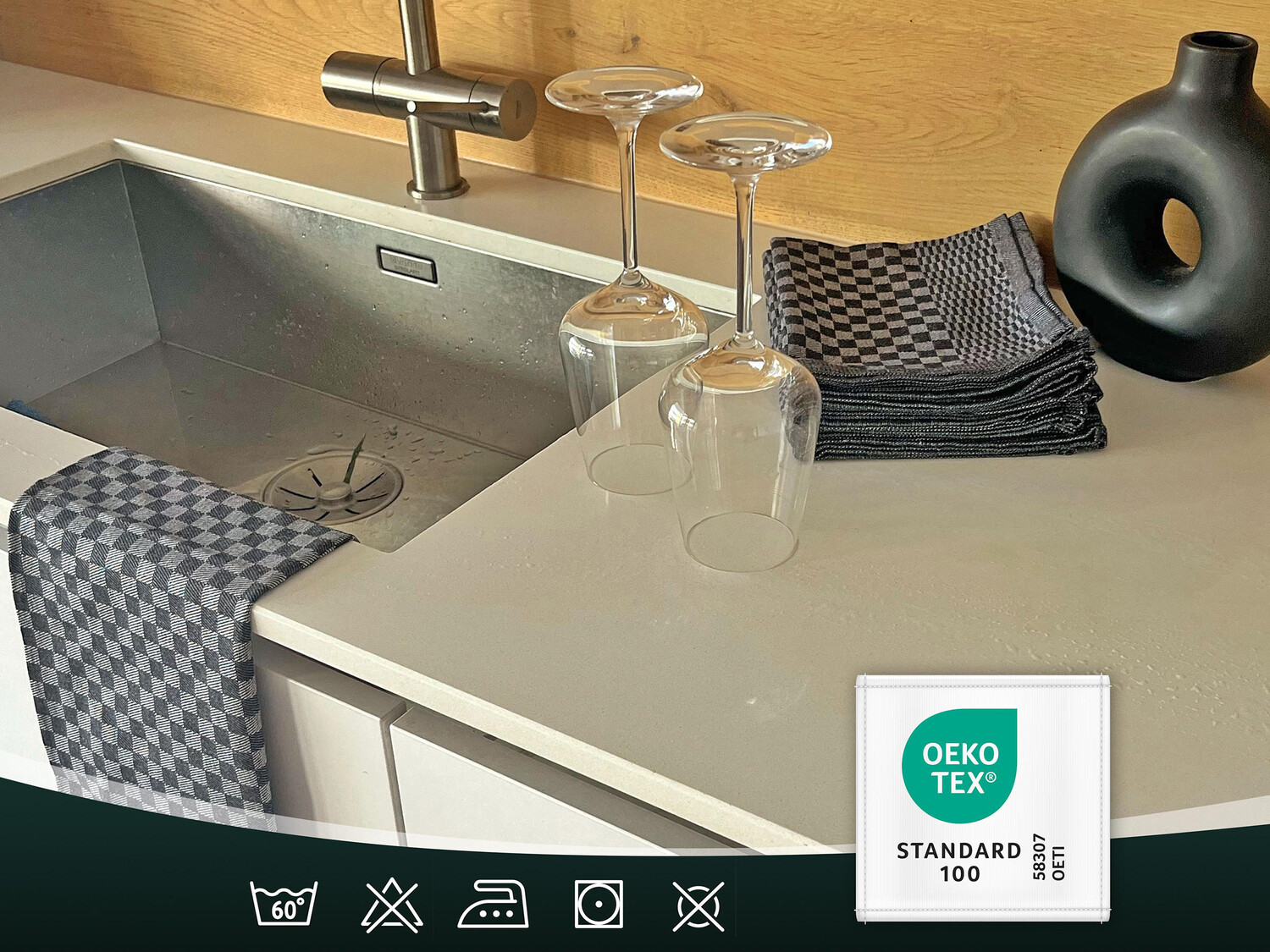 Классические, но современные — эти красивые кухонные полотенца с клетчатым рисунком поставляются в практичной упаковке по 10 штук. Чтобы вы могли подобрать цвет, подходящий для вашей кухни, полотенца для сушки доступны в различных цветах. Они имеют размер 46x70 см и оснащены вешалкой. Качественные кухонные полотенца изготовлены из 100% хлопка и имеют плотность материала 220 г/м². Скрученные нити натурального материала обеспечивают высокую впитываемость и делают кухонные полотенца очень прочными. Для обеспечения гигиенической чистоты кухонные полотенца можно стирать в стиральной машине при температуре до 60°С и сушить в стиральной машине. Даже после частой стирки хлопковые кухонные полотенца не теряют прочности материала и остаются надежным помощником на кухне.