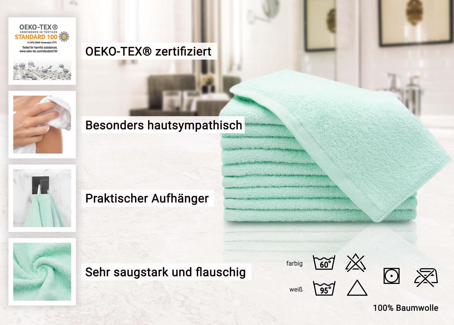 Шикарное гостевое полотенце – обязательный атрибут современной ванной комнаты. Это означает, что ваши гости смогут гигиенично высушить руки и лица. Набор из 10 штук означает, что вы всегда готовы к спонтанным посетителям. Полотенца изготовлены из 100% хлопка, переплетенного в махровую ткань. Это делает полотенце особенно впитывающим и чрезвычайно комфортным для кожи. Они имеют плотность материала около 450 г/м² и оснащены практичной вешалкой. Благодаря большому выбору цветов можно найти подходящий цвет на любой вкус. Кусочно окрашенные мыльные полотенца можно стирать при температуре до 60°C (цветное) и до 95°C (белое). Их также можно сушить в сушильной машине. Поскольку мыльные полотенца мятного цвета не имеют каймы, они особенно стабильны по размерам.