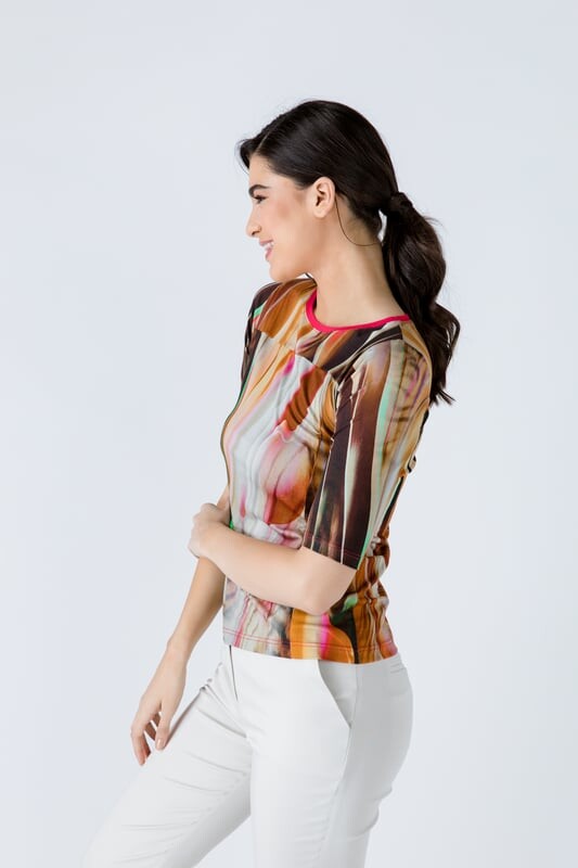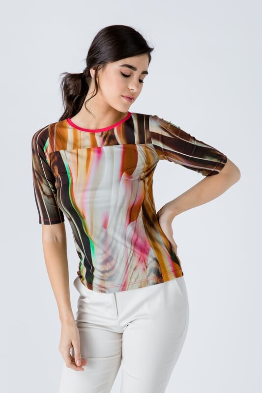 Топ из эластичного джерси с принтом. Круглый вырез горловины и рукава ¾. Деталь шва на груди. Рост нашей модели 172 см, размер 36/S. Замеры на 38 размер (в см): плечо -32; грудь-40; Талия-40; ягодицы-44; Длина рукава – 31; Длина тела-50. Одежда приталенная. 92%ВИСКОЗА-8%ЭЛАСТАН