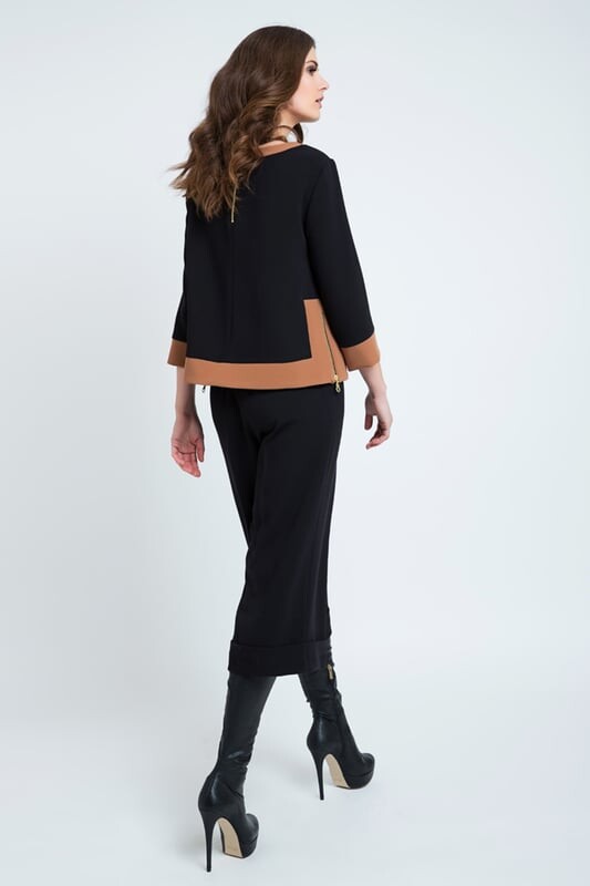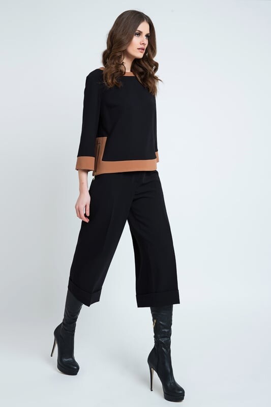 Черные брюки-кюлоты из ткани легкой стрейч. Пояс шириной 5 см, застежка-молния и черная пуговица. Широкая, прямая штанина с подворотом вверху на 5,5 см. Длина для 38 размера: 81см. Ширина низа для 38 размера: 33 см. Рост нашей модели 178 см, размер 36.