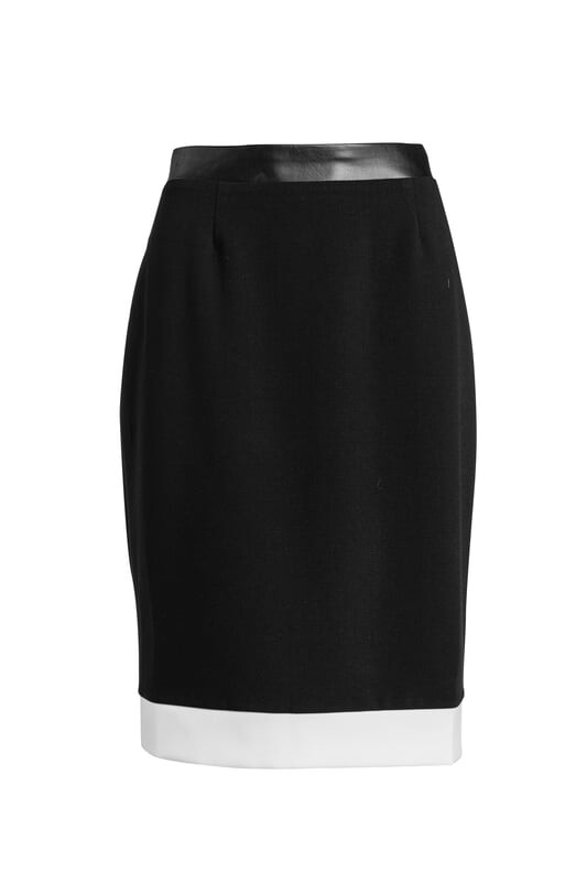 Юбка-карандаш миди из эластичной ткани. Пояс шириной 4 см из искусственной кожи. Складки под поясом спереди и 2 сзади для идеальной посадки. Контрастный край кремового цвета (6см). Толстая черная молния шириной 18 см сзади. Сзади разрез длиной 12 см. Кормили. Длина юбки для 38 размера: 64см.