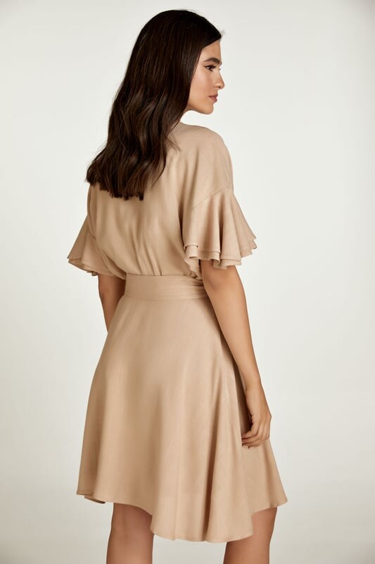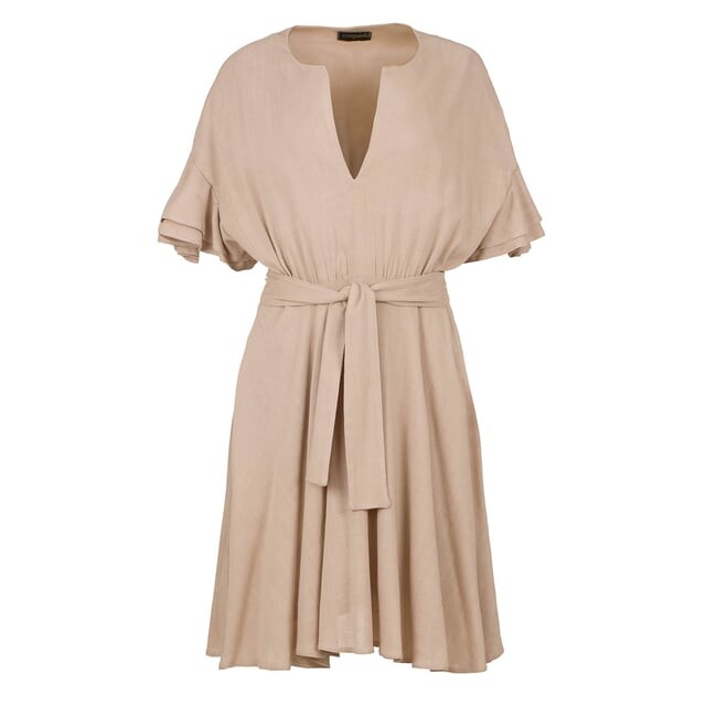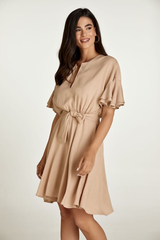 Бежевое платье изготовлено из льняной ткани. У него короткие рукава с двойными рюшами и заниженная линия плеча. Имеет круглый вырез горловины с V-образным вырезом спереди. Под грудью изогнутый подол, под которым платье трансформируется в клош. Внутри имеется потайная молния, благодаря которой платье легко надевать. Это подкладка. Платье можно носить как с поясом, так и без него, который выполнен из той же ткани. Ремень входит в комплект.
