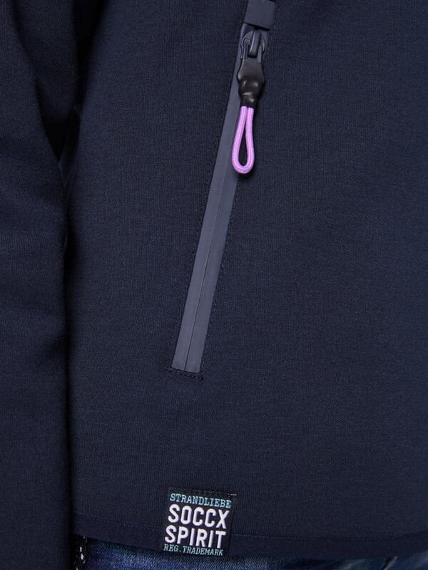 Эта куртка с капюшоном от бренда SOCCX благодаря классному сочетанию материалов выглядит по-настоящему спортивно для женщин. Перед и рукава выполнены из интерлока, а капюшон и спинка — из стеганой полиэфирной тафты. Эффектен полосатый край капюшона с регулируемой резинкой. Принт с логотипом на спине подчеркивает капюшон. Эластичные ленты на передней молнии и карманах на молнии подчеркивают морской вид.