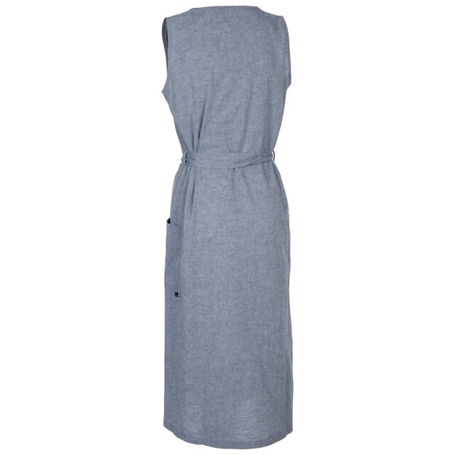 Материал: 55% лен, 45% хлопок. Ткань: шамбре, тканое. Узор: Сплошной цвет Шлевки для ремня, пояс для завязки. Застежка: кнопка вниз. Вырез: V-образный. Тип рукава: Без рукавов Карманы: 2 боковых кармана, накладной.
