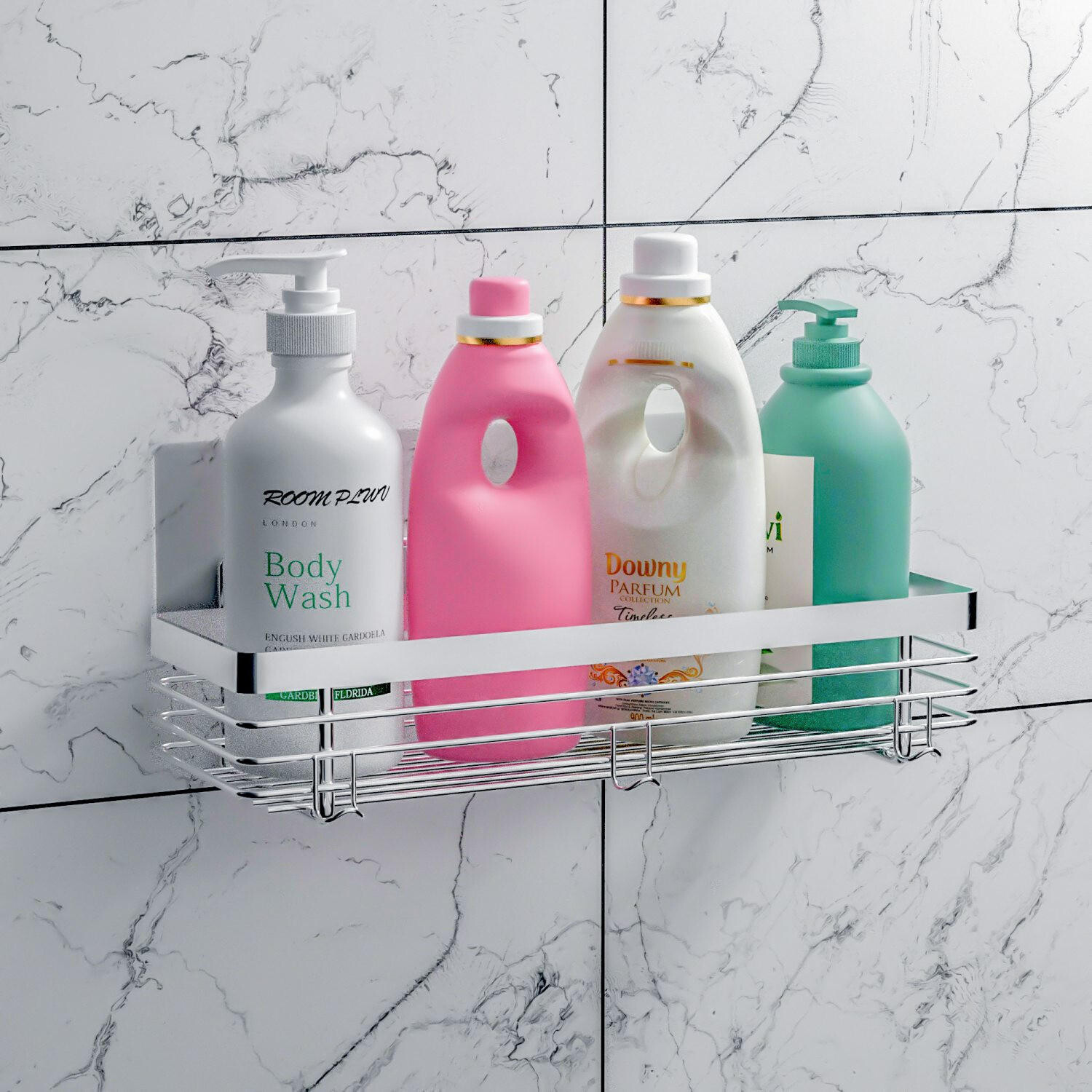 Самоклеящаяся подставка для душа IntirilifeС самоклеющейся подложкой, которая приклеивается к стеклянным панелям, плитке и мрамору, подставка для душа упорядочит вашу ванную комнату и поможет вам сэкономить драгоценное время. На нем удобно помещается все необходимое для ежедневного ухода. Помимо места для хранения средств по уходу за кожей, шампуня, бритвы и мыла, имеются 3 крючка для губок или салфеток. Закругленные края и современный дизайн, а также устойчивость к ржавчине и минимальные затраты на очистку — это лишь некоторые из многих практических преимуществ не только в ванной, но и в коридоре в качестве ключницы или на кухне. подставка для специй станет прекрасным дополнением к вашей мебели. Материал и размер: нержавеющая сталь серебристого цвета, 32 x 14 x 10,5 см.