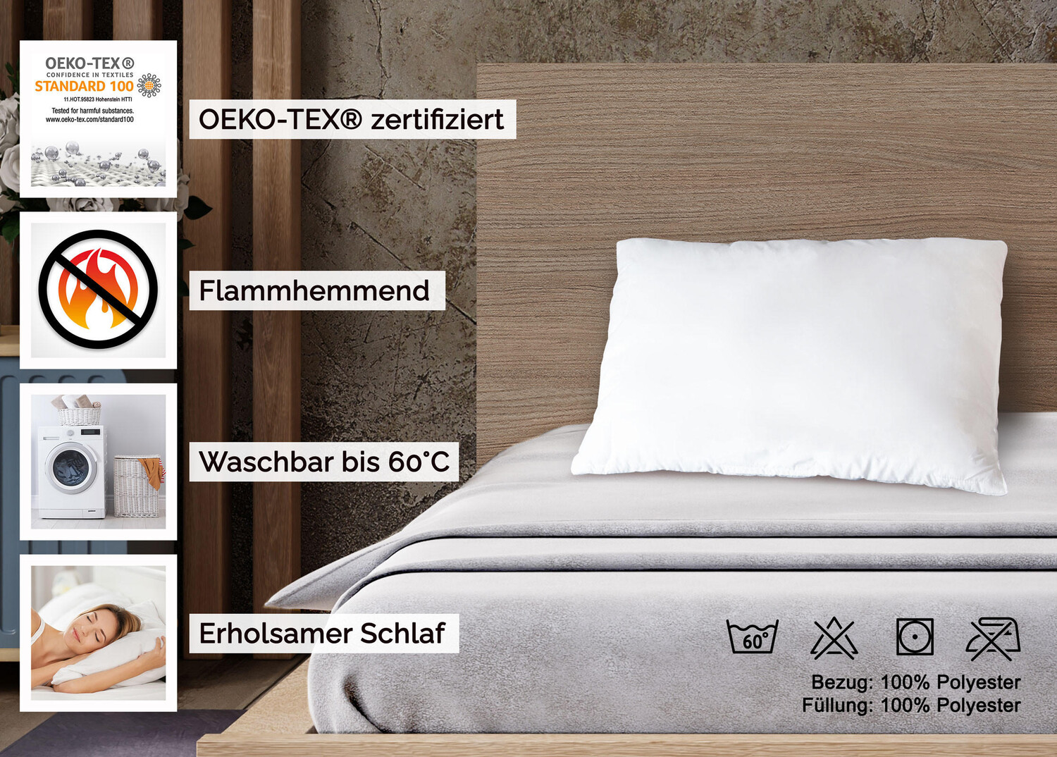 Тлеющие сигареты всегда представляют собой риск, но с этой подушкой из огнестойкого полиэстера риск снижается, поскольку как чехол, так и наполнитель проверены в соответствии со стандартом DIN EN ISO 12952-2. В ходе испытания не наблюдалось возгорания подушки, вызванного тлеющей сигаретой. Огнестойкость также означает, что тлеющий текстиль автоматически перестанет обугливаться в течение короткого времени после того, как источник возгорания будет потушен или удален. Эта высококачественная набивка из 100% полиэстера также очень пушистая и обеспечивает приятный комфорт во время сна. Гипоаллергенная спальная подушка размером 60x80 см с наполнителем 630 г проста в уходе, ее можно стирать при температуре 60°C и сушить в стиральной машине.