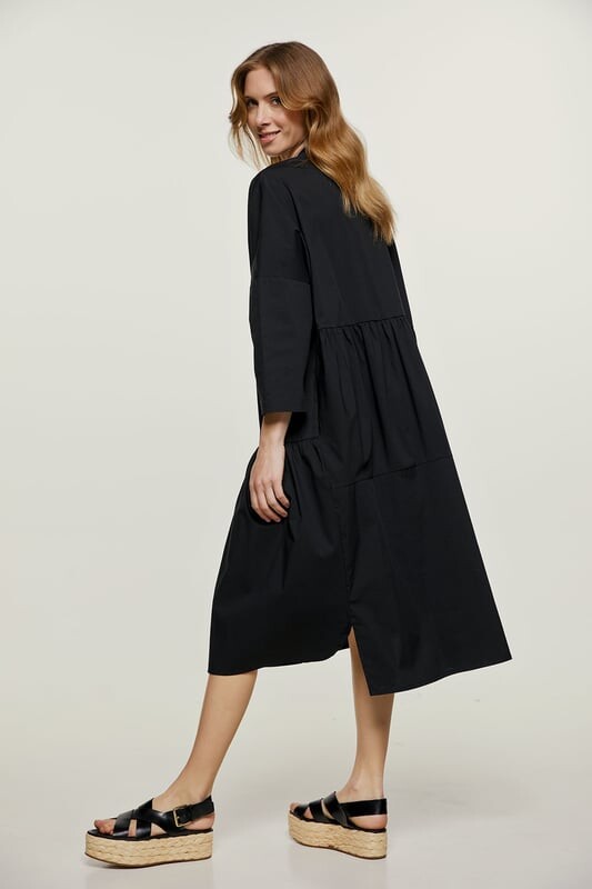 Черное платье свободного кроя выполнено из тканого поплина. У него заниженная линия плеча и длинные рукава ¾. Имеет круглый вырез горловины и воротник-стойку. Спереди планка на талии с декоративными пластиковыми пуговицами. Имеет внутренние боковые карманы и пояс из той же ткани. В нижней части широкая полоса с рюшами создает легкий эффект рюшей. Платье имеет свободный силуэт и среднюю длину.