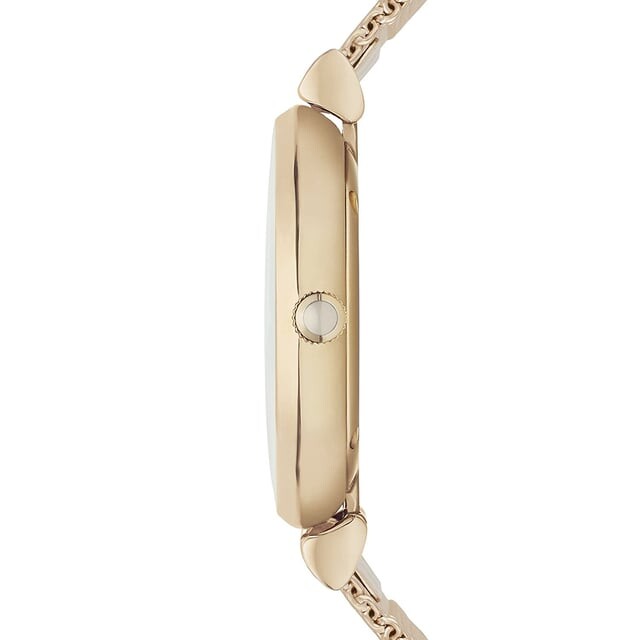 Часы имеют золотой корпус из нержавеющей стали диаметром 32 мм с аналоговым дисплеем и оснащены кварцевым механизмом.