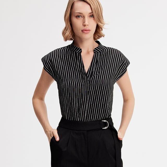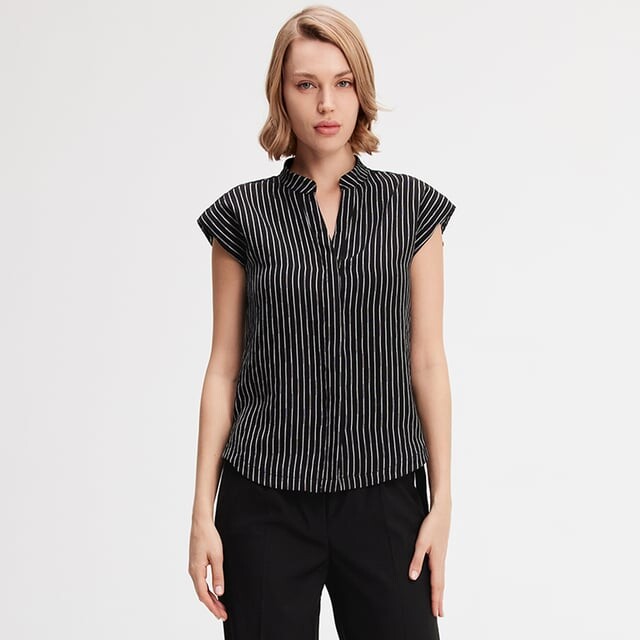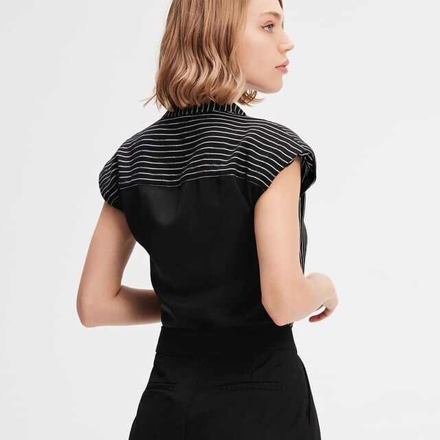 Минималистичный и вневременной стиль, декорированный двумя тканями: спереди из вискозы с тонкими полосками и сзади из простой фланели. Носите с джинсами или с более формальной юбкой и строгим жакетом для офиса. Универсальная вещь, которую можно носить отдельно или дополнить поясом. Подробная информация о товаре - Форма: прямая - Длина: 62 см, - Без рукавов - Воротник-стойка - Застегивается посередине спереди.