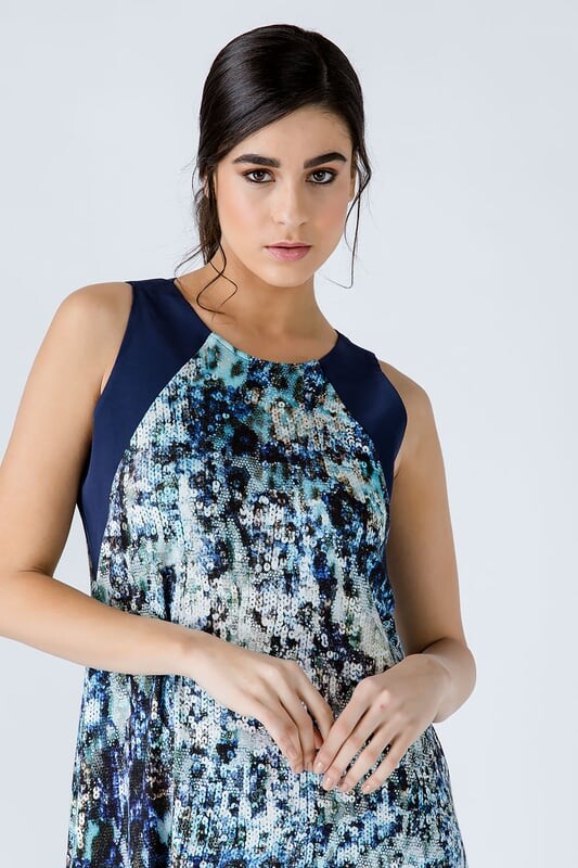 Летнее платье выполнено из вискозно-эластановой ткани с принтом. На плечах креповая ткань темно-синего цвета. Оно без рукавов и имеет круглый вырез. Застегивается на декоративную пластиковую кнопку сзади. Платье без подкладки, А-силуэта.