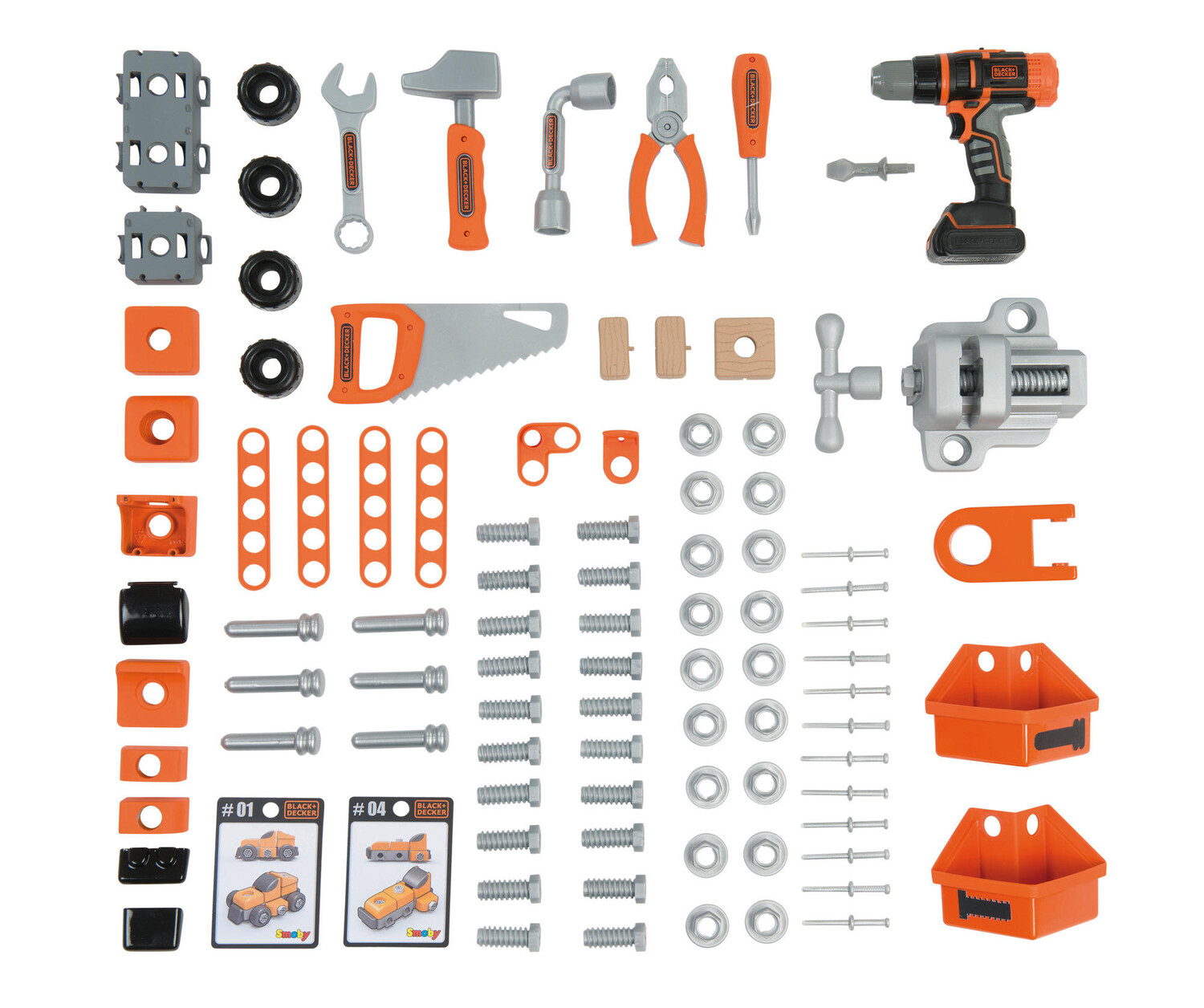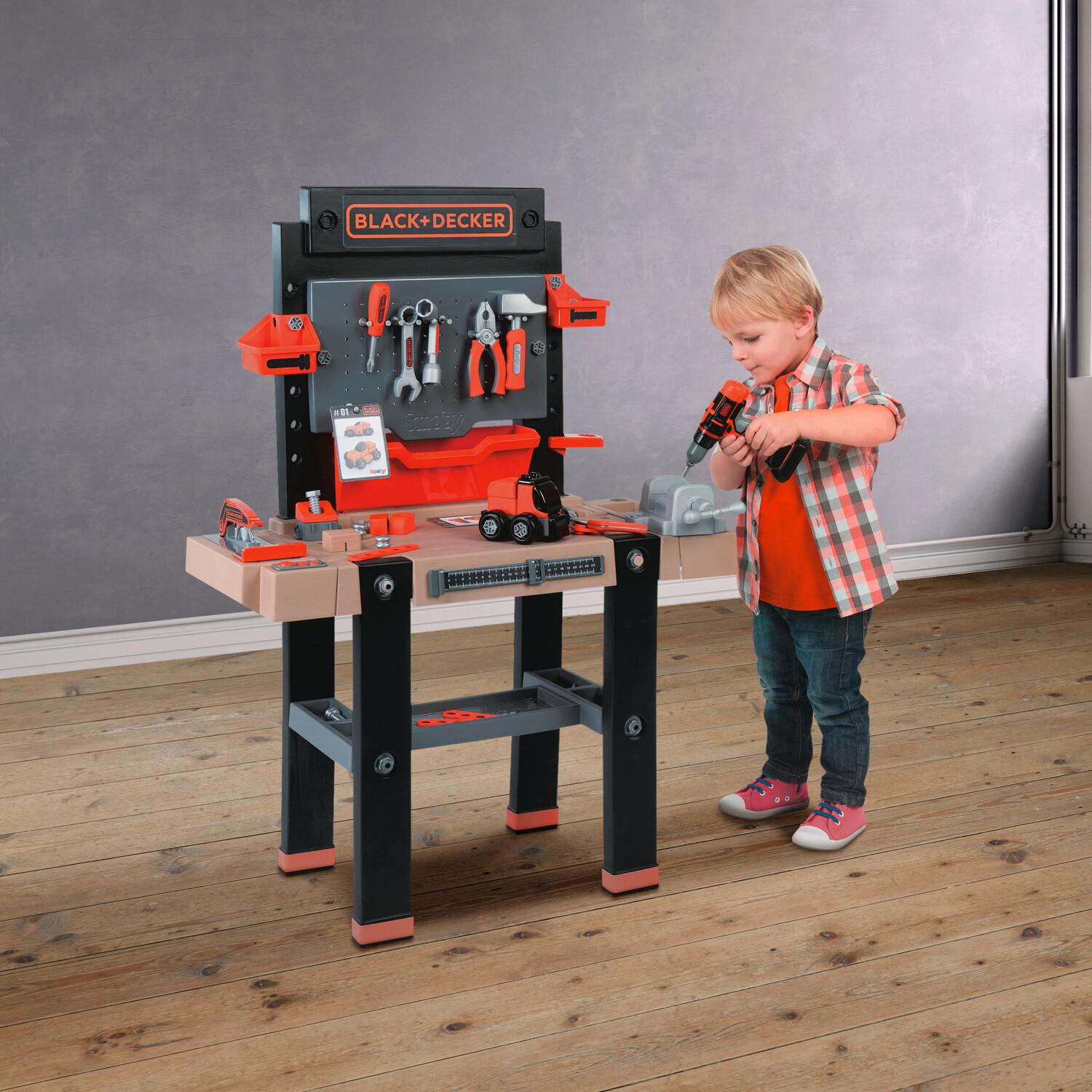 Суперверстак SMOBY «BLACK & DECKER Super Workbench» заставляет сердца всех детей от 3 лет и старше, которые хотят заниматься такими делами, как папа или мама, биться быстрее. Прежде всего, реалистичный вид впечатляет большой рабочей поверхностью деревянной конструкции, перфорированной стенкой, различными полками и складным отделением, которое служит практичным местом для хранения шурупов и гвоздей. Комплект автомобиля и 95 аксессуаров делают счастье мастера идеальным. Что может быть лучше, чем взять электрическую аккумуляторную отвертку и соединить строительные блоки, чтобы создать различные транспортные средства? По общему признанию, распиловка пластиковых кусков дерева с помощью циркулярной пилы со звуком также доставляет массу удовольствия. Кроме того, есть 7 ручных инструментов, которые можно попробовать использовать: от молотка до отвертки и плоскогубцев. Лучший способ сделать это — использовать бесплатное загружаемое обучающее приложение для устройств Android и iOS. Электронные звуковые кнопки и скользящая линейка на передней панели SMOBY «BLACK & DECKER Super Workbench» эффектно дополняют ощущение аутентичности. Шедевр для занятых детей!