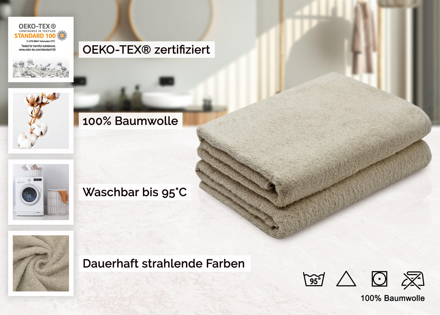 Превратите прием душа в истинное удовольствие. С этими пушистыми, мягкими полотенцами светло-коричневого цвета расслабление продолжается даже после теплого душа. Полотенца изготовлены из 100% хлопка и переработаны в уютную махровую ткань, что делает их особенно впитывающими. Не следует забывать, что они очень приятны на коже. Безопасные для кожи полотенца для душа в двойной упаковке доступны в великолепных цветах. Благодаря индантреновому окрашиванию сияющий цвет сохраняется надолго даже после стирки. Они оснащены практичной вешалкой и имеют двойной предохранительный шов по длинным сторонам. Полотенца для душа плотностью около 420 г/м² и размером 70x140 см устойчивы к кипячению, стираются и сушится в стиральной машине.
