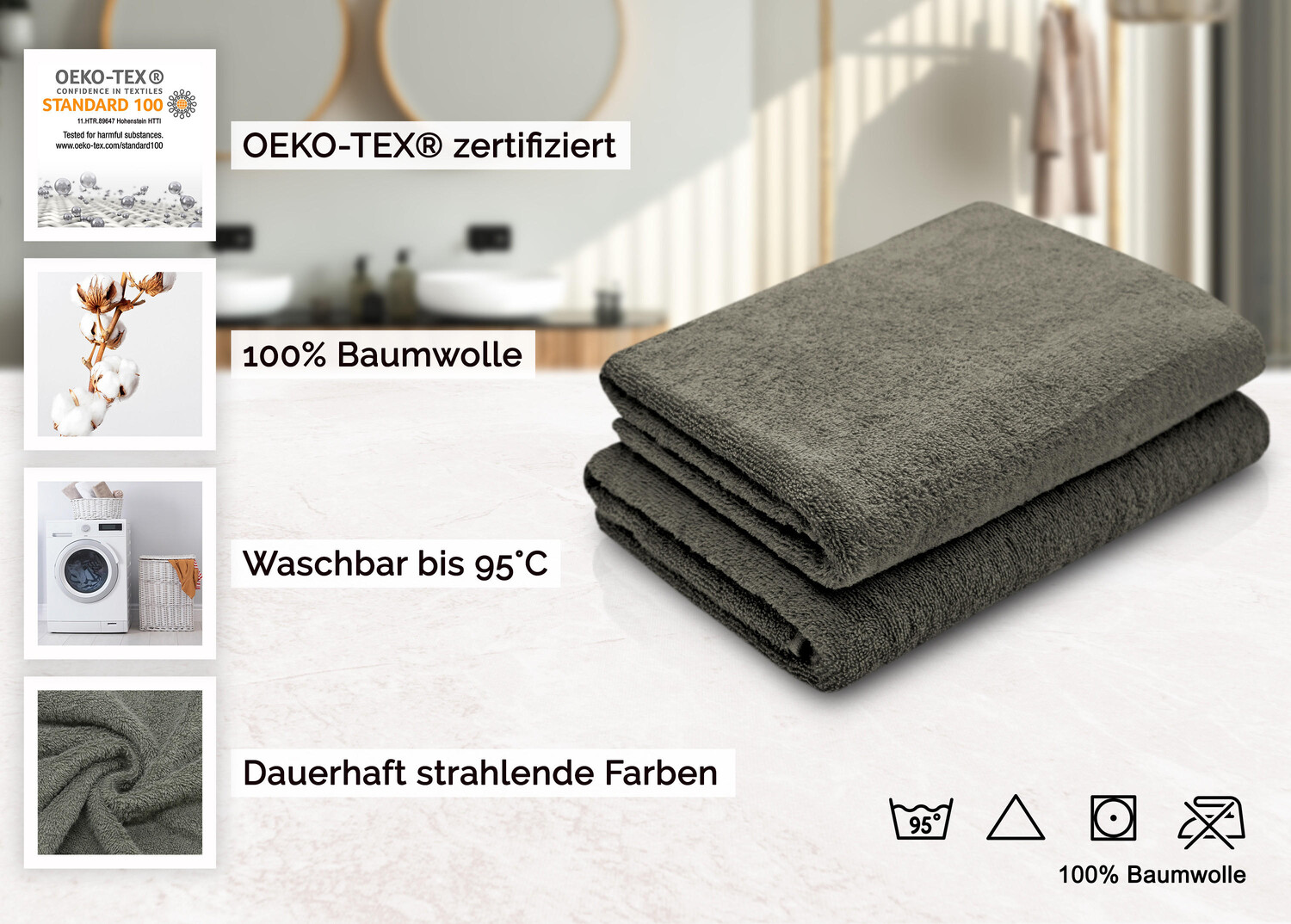Превратите прием душа в истинное удовольствие. С этими пушистыми и мягкими полотенцами серо-коричневого цвета расслабление продолжится даже после теплого душа. Полотенца изготовлены из 100% хлопка и переработаны в уютную махровую ткань, что делает их особенно впитывающими. Не следует забывать, что они очень приятны на коже. Безопасные для кожи полотенца для душа в двойной упаковке доступны в великолепных цветах. Благодаря индантреновому окрашиванию сияющий цвет сохраняется надолго даже после стирки. Они оснащены практичной вешалкой и имеют двойной предохранительный шов по длинным сторонам. Полотенца для душа плотностью около 420 г/м² и размером 70x140 см устойчивы к кипячению, стираются и сушится в стиральной машине.