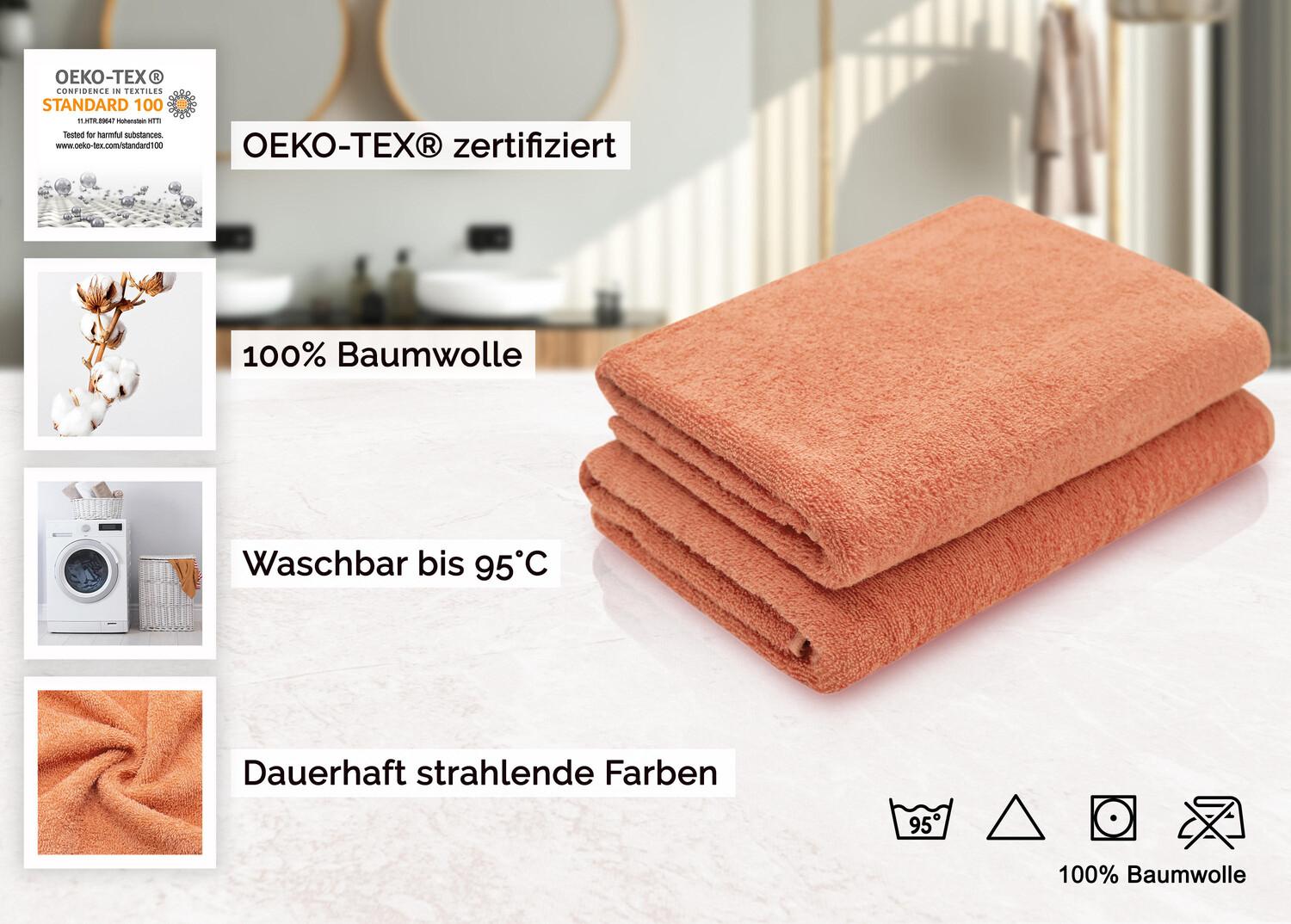 Превратите прием душа в истинное удовольствие. С этими пушистыми и мягкими полотенцами оранжевого цвета расслабление продолжается даже после теплого душа. Полотенца изготовлены из 100% хлопка и переработаны в уютную махровую ткань, что делает их особенно впитывающими. Не следует забывать, что они очень приятны на коже. Безопасные для кожи полотенца для душа в двойной упаковке доступны в великолепных цветах. Благодаря индантреновому окрашиванию сияющий цвет сохраняется надолго даже после стирки. Они оснащены практичной вешалкой и имеют двойной предохранительный шов по длинным сторонам. Полотенца для душа плотностью около 420 г/м² и размером 70x140 см устойчивы к кипячению, стираются и сушится в стиральной машине.