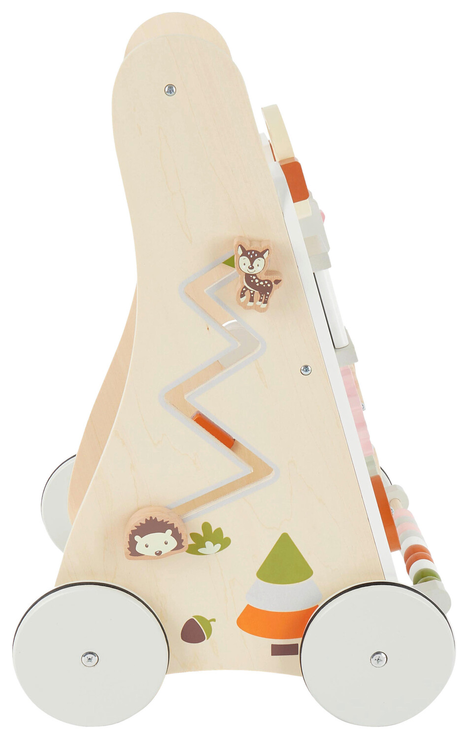 С этими деревянными ходунками (от 12 месяцев) первые шаги становятся детской игрой - коляска помогает сохранять равновесие при ходьбе. Ручка игрушки высотой около 51 см прикреплена таким образом, чтобы способствовать прямохождению. Резиновые детали на колесах обеспечивают бесшумное передвижение. Кроме того, аксессуар предлагает множество игровых возможностей, тренирующих моторику детей. Благодаря элементам для толкания, включения и поворота здесь есть что открыть. Милый дизайн в зеленом, белом, натуральных и оранжевых тонах с мотивами лесных животных подчеркивает творческую атмосферу. Если вы хотите взять с собой в путешествие по квартире любимого плюшевого мишку, он легко найдет место в практичном отделении для хранения вещей. спина. Эти деревянные ходунки (подходят от 12 месяцев) помогут вашему малышу исследовать мир!