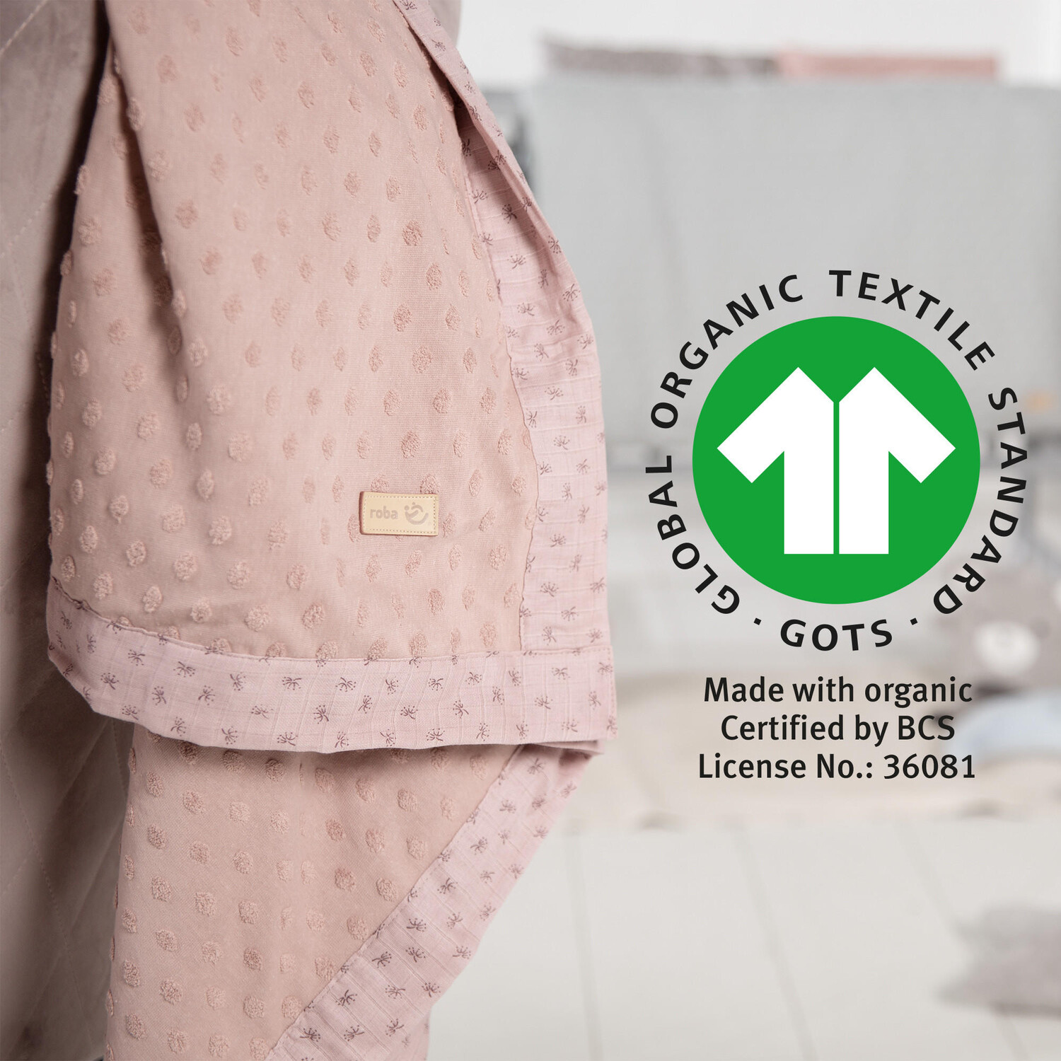 Органическое детское одеяло roba «Lil Planet» обеспечивает ощущение уюта и сухости в детской кроватке благодаря приятной для кожи, не загрязняющей окружающую среду, водопоглощающей и очень мягкой ткани из органического хлопка. Используются только дышащие материалы, чтобы ребенок не перегрелся. При производстве органических детских товаров используются самые чистые, экологически чистые и необработанные материалы. Даже после многочисленных стирок органические детские товары сохраняют свою форму и мягкость на ощупь. Благодаря специальной обработке поверхности и предварительной стирке изделия остаются очень мягкими. Серия органического текстиля roba «Lil Planet» доступна в модных цветах: розовом/лиловом, голубом/небесном и серебристо-сером. Эта текстильная серия производится экологически устойчиво в соответствии с Глобальным стандартом органического текстиля GOTS и на справедливых и социальных условиях Инициативы по социальному соответствию бизнеса (BSCI). Серия сертифицирована по самым строгим экологическим критериям в соответствии со стандартом OEKO TEX 100. Детское одеяло можно стирать при экологически чистой температуре 40°C. Верх: Terry Dot, 80 % органический хлопок GOTS, 20 % полиэстер, низ: Муслин, 100 % органический хлопок. Цвет: розовый/лиловый