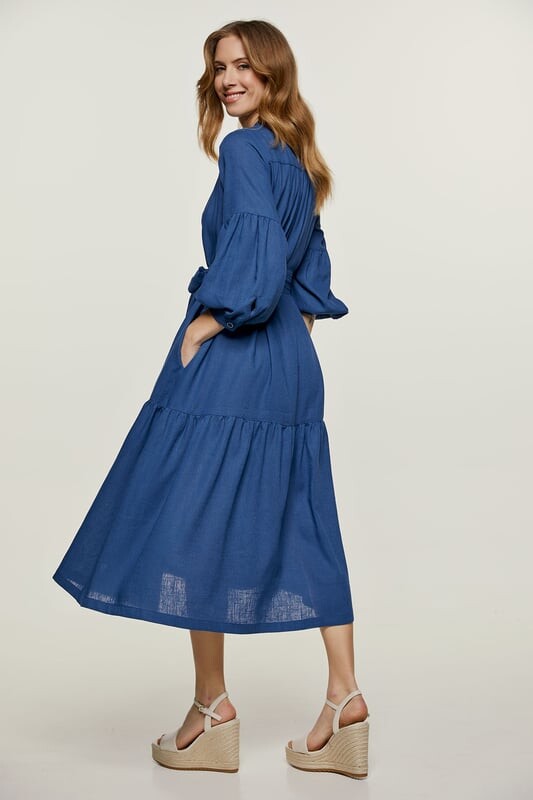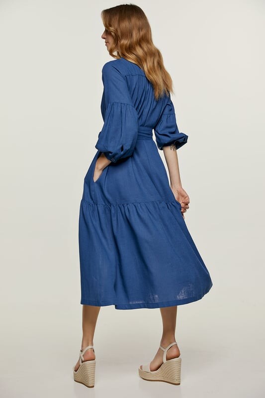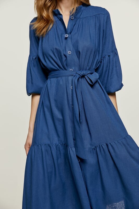 Синее платье миди изготовлено из льняной ткани. Имеет круглый вырез горловины и небольшой воротник-стойку. У модели заниженная линия плеча, рукава-буфы и манжеты, закрывающиеся на пластиковую пуговицу. Спереди планка с декоративными пластиковыми пуговицами и внутренние боковые карманы. В нижней части широкая вставка с рюшами создает легкий эффект рюшей. Платье можно носить как с поясом, так и без него.