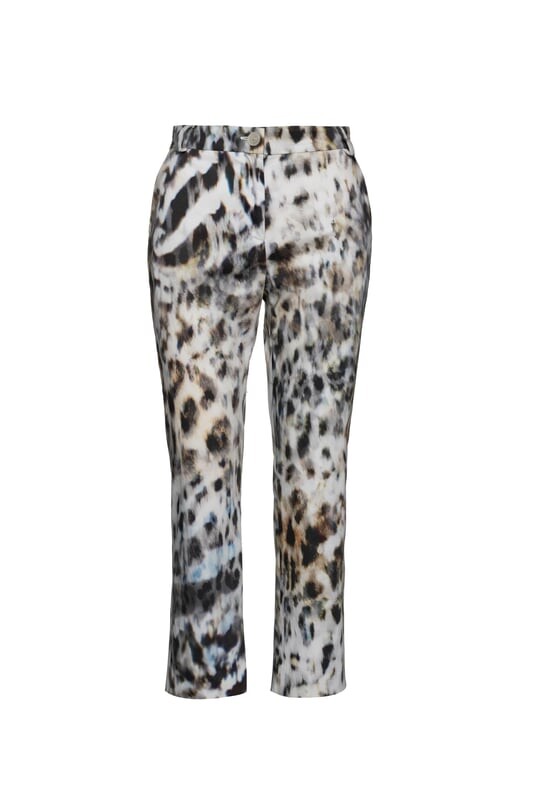 Эти приталенные брюки длиной до щиколотки изготовлены из тканого габардина с животным принтом. Имеет два внутренних кармана спереди и два ложных кармана сзади. Имеется пояс со шлевками для ремня. Брюки застегиваются спереди на пластиковую пуговицу цвета экрю и потайную молнию.