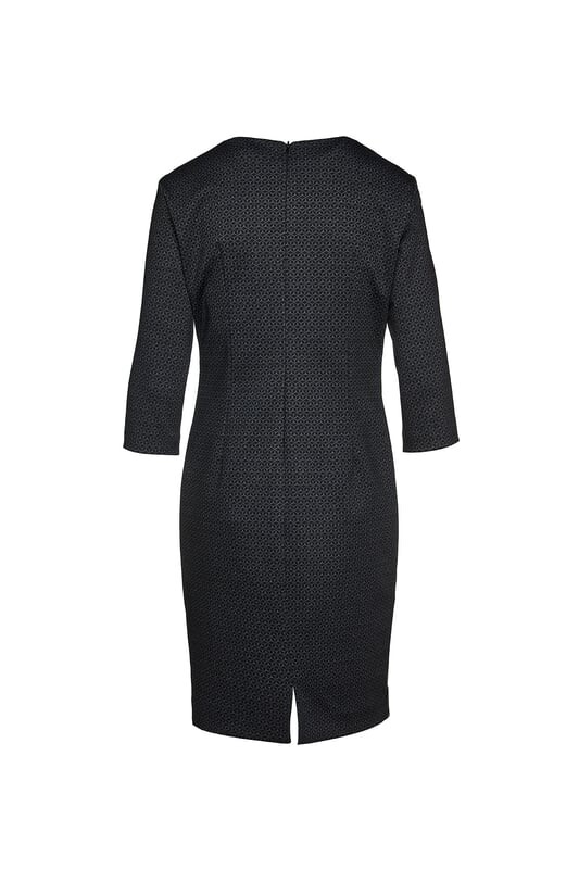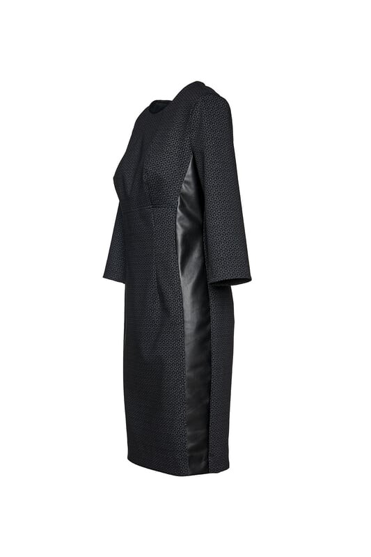 Платье-карандаш из ткани Punto di Roma с принтом. Круглый вырез горловины и рукава ¾. Потайная молния на спине. Декоративные швы – вытачки спереди, которые начинаются от выреза горловины и заканчиваются на талии. Шов под грудью, образующий изящную линию ампир. Вставка из искусственной кожи шириной 6 см сбоку от подмышек до подола. Сзади небольшой разрез длиной 10 см. Полностью на подкладке. Приталенный силуэт.