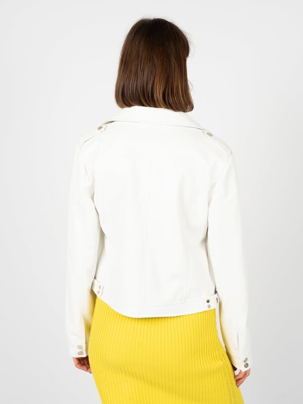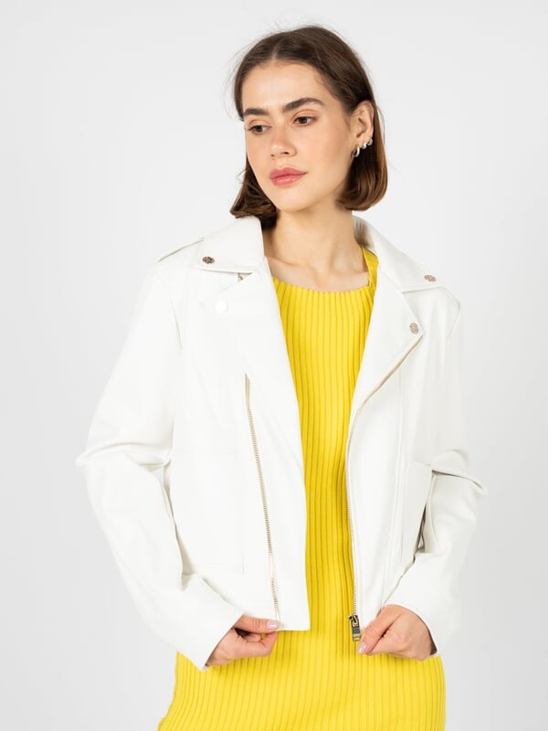 Байкерская куртка Адаптированный крой Короткий крой С воротником Застегивается на фирменную молнию С клапанами на плечах Два прорезных кармана спереди Декорированы заклепками с логотипом Металлические элементы золотого цвета Изготовлены из высококачественной искусственной кожи