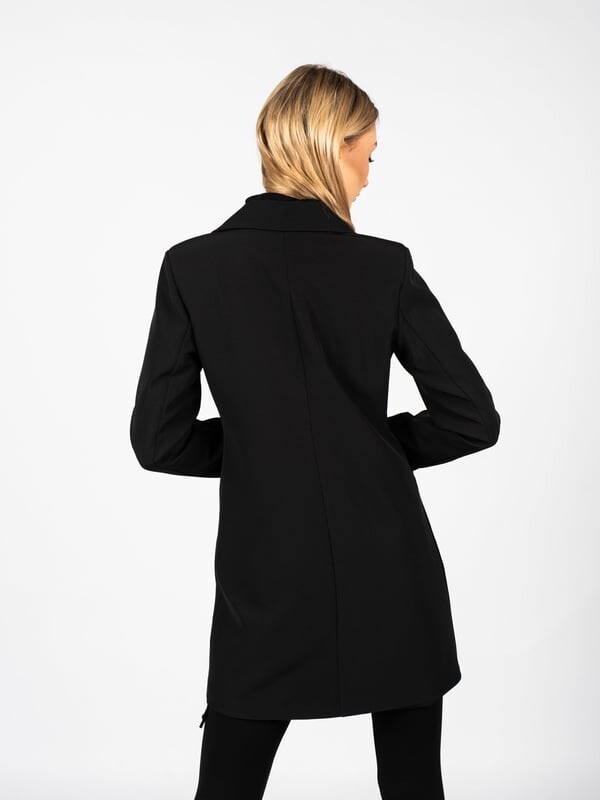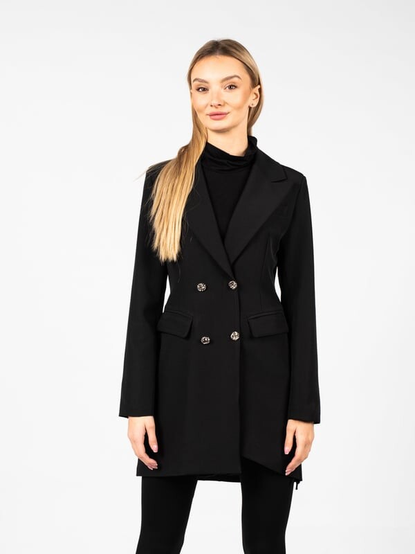 Индивидуальный крой, удлиненный крой. Двубортный. Застегивается на декоративные пуговицы. Передняя часть с тремя врезными карманами. Манжеты на двух пуговицах. Изготовлено из высококачественной ткани. Сделано в Италии.