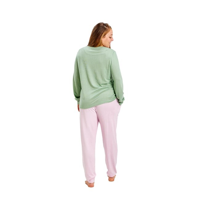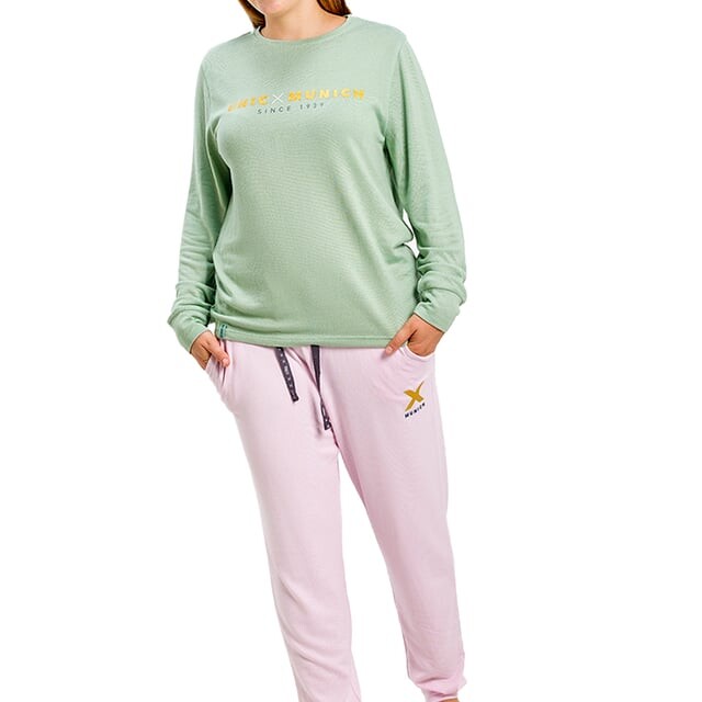 Пижама с длинными рукавами Мюнхен. Цвет розово-зеленый. Футболка с длинными рукавами и круглым вырезом. Напечатан клетчатый узор. Дизайн с фирменной графикой. Длинные брюки. Пояс на резинке. Низ прямого кроя. Видим швы одного цвета. Состав: 96% полиэстер, 4% эластан. -Стирать при максимальной температуре. 30°. -Не используйте отбеливатель. -Гладить при максимальной температуре. 110°. - Не переносит химчистку. -Позволяет использовать сушильную машину.