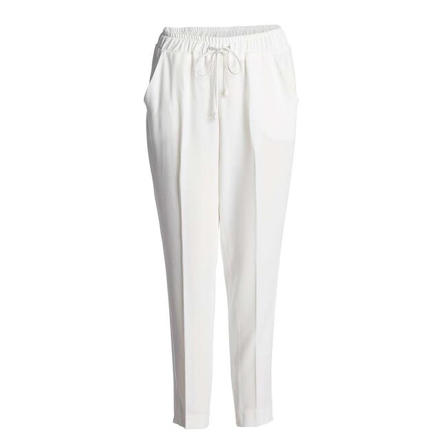 Брюки цвета экрю из креповой ткани с зауженными брючинами. Эластичный пояс и завязки, закрывающиеся спереди. Два кармана спереди. Рост нашей модели 176 см, размер 36/S. Размеры для размера 36/S (в см): талия-30, ягодицы-47, длина тела (внутри/снаружи)-71/91. Аксессуары не включены. 92%Полиэстер-8%Эластан