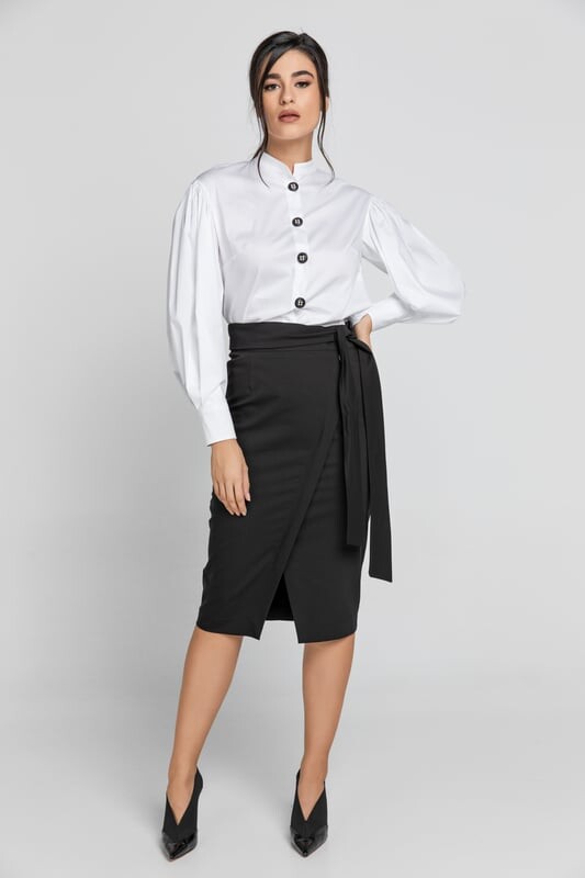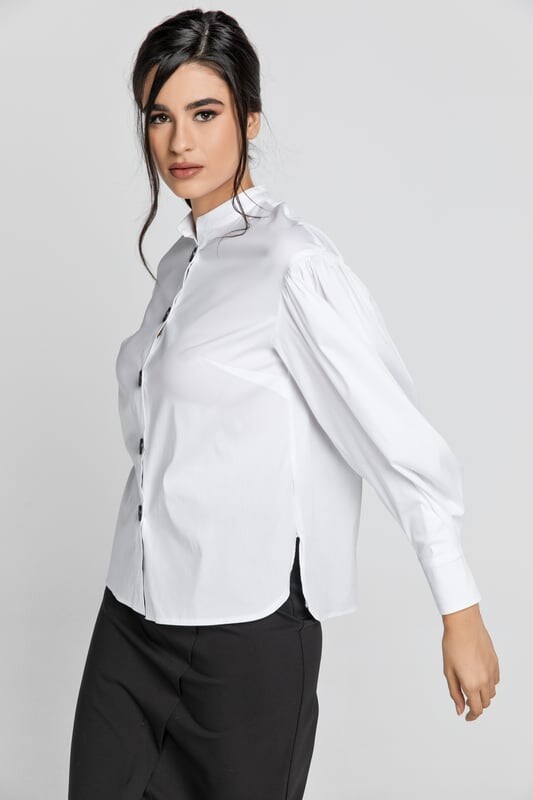 Эта белая рубашка с длинными рукавами и воротником Неру. Имеет оборки на плечах и две пуговицы на манжетах. Вытачки на груди обеспечивают привлекательную посадку. Рубашка застегивается спереди на 5 больших пуговиц. Подол закруглен. Заправьте его в юбку-карандаш с высокой талией и добавьте пару каблуков, чтобы привлечь внимание. 97%Хлопок-3%Эластан