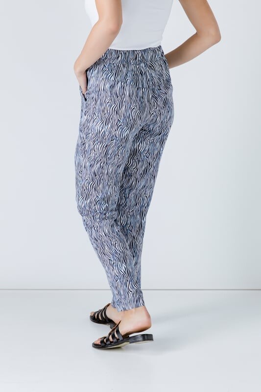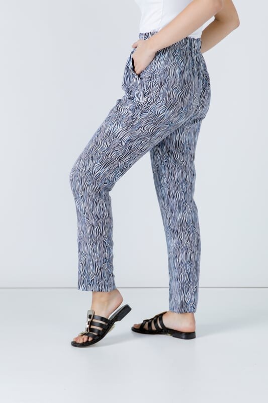 Летние зауженные брюки изготовлены из тканого принтованного полотна, 100 % вискозы. Имеет эластичную талию шириной 4 см и 2 боковых кармана. Для удлинения к низу прикреплено 4 см дополнительной ткани.