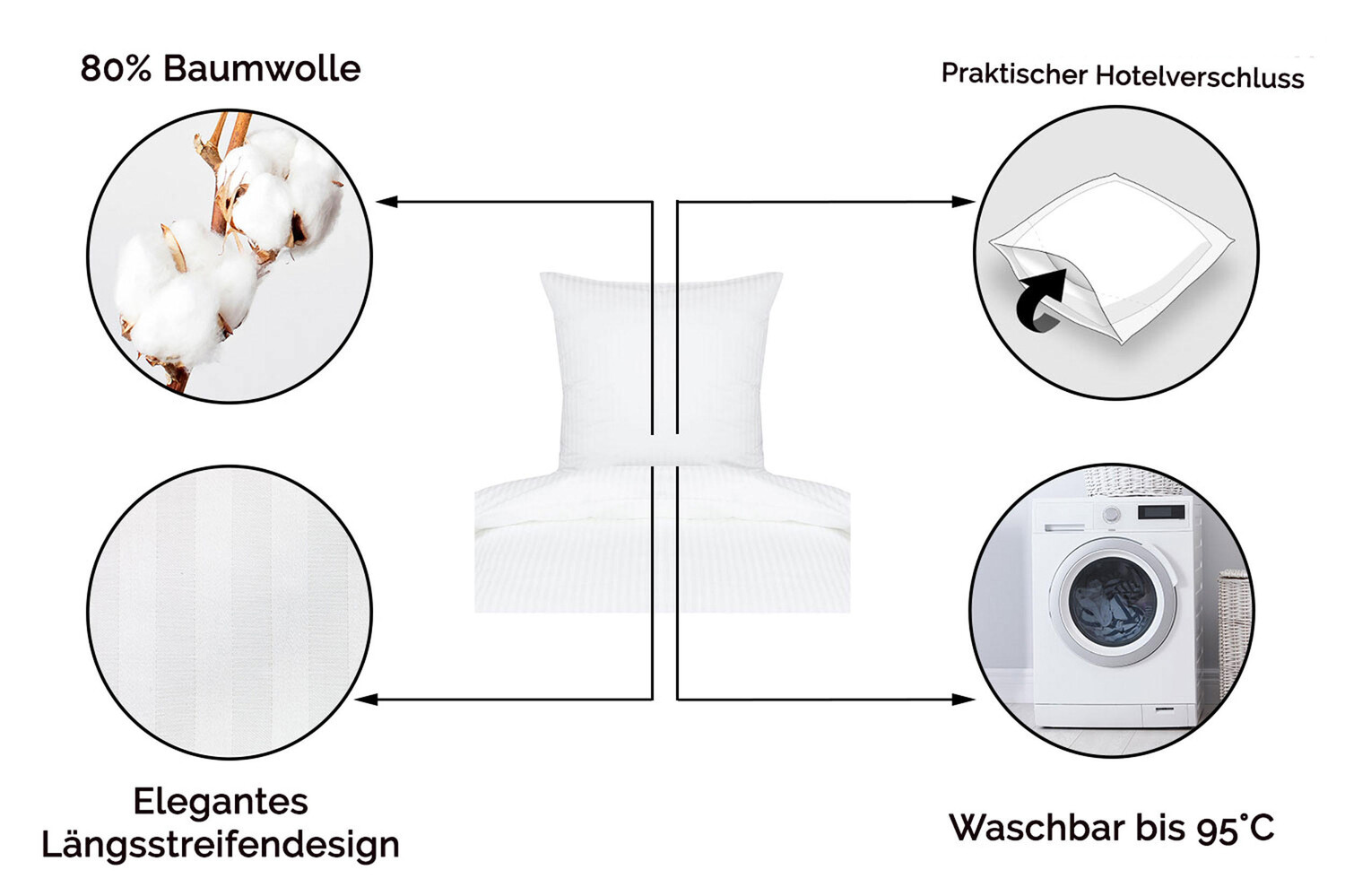 С этим легким комплектом постельного белья вы сможете насладиться спокойным сном. Он имеет приятный вес около 145 г/кв.м. Мы придаем большое значение проверенному производству. Красиво полосатое постельное белье из смеси хлопка можно стирать при температуре до 95°C, безопасно кипячить и использовать хлор, а также сушить в стиральной машине. Простой комплект постельного белья состоит из наволочки размером ок. 80 х 80 см и пододеяльник размером примерно 135 х 200 см. Благодаря ненавязчивому дизайну постельное белье прекрасно комбинируется. Благодаря практичному замку постельное белье также можно быстро и легко сменить. Это значит, что порванные пуговицы и застрявшие молнии остались в прошлом.