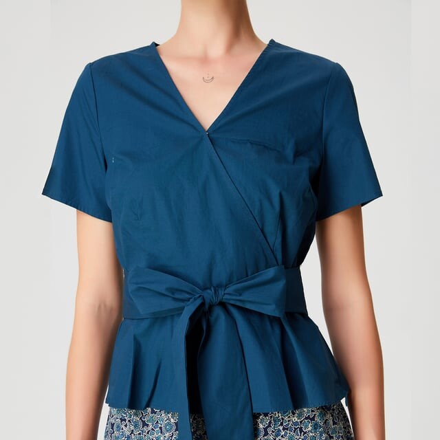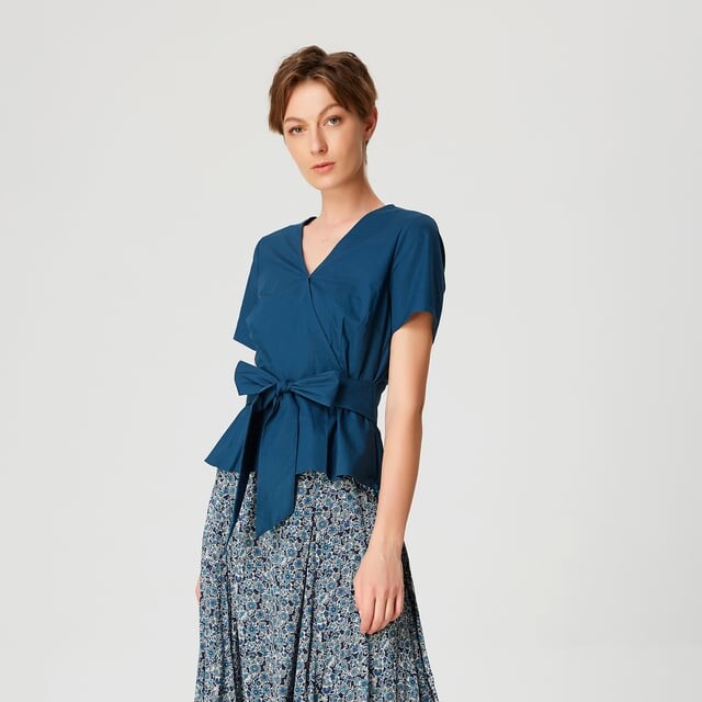 Этот женственный топ изысканного кроя украшен широким поясом, который можно завязать как спереди, так и сзади. Грудь элегантно подчеркнута V-образным вырезом, образованным поперечным вырезом и подчеркнутым вытачками для груди. Сочетается с прямой юбкой или брюками-сигаретами. Подробная информация о товаре - Форма: приталенная и расклешенная - Короткие рукава - V-образный вырез - Потайная молния сбоку и кнопка на вырезе - Длина: 57 см