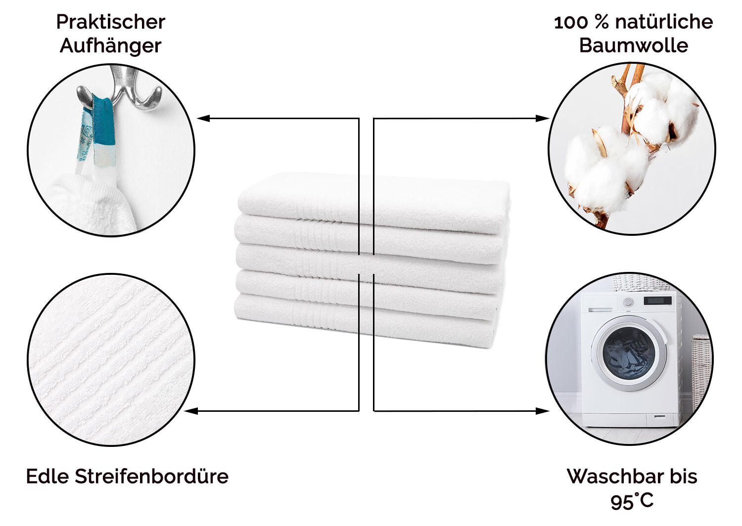 С этим набором махровых полотенец вы получите необыкновенно красивую и пушистую походную посуду. Мягкие полотенца для сауны изготовлены из 100% высококачественного хлопка, обладают высокой впитывающей способностью и очень прочны благодаря хорошему качеству изготовления. Красивые глубокие полосы на гладкой поверхности придадут элегантный вид вашей ванной комнате. Полотенца имеют практичную вешалку, благодаря которой их можно повесить в любом месте для сушки или хранения. Полотенца для сауны размером примерно 70x180 см можно стирать при температуре до 60°C (белые - 95°C), они устойчивы к кипячению и подходят для стирки. Сушка в сушильной машине благодаря весу 380 г/м² приятна для кожи.