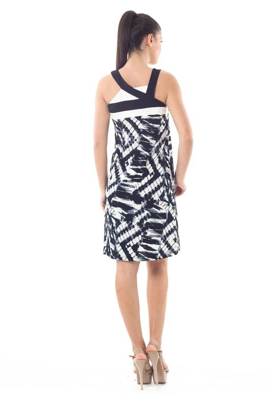 Осмельтесь отличаться от других в этом привлекательном платье! Приятный силуэт умело подчеркнут асимметричными вставками из контрастной ткани и придает платью особую харизму. Без рукавов. На изображенной модели рост 178 см, размер 36/S.