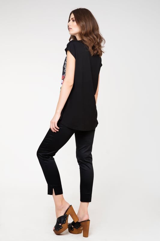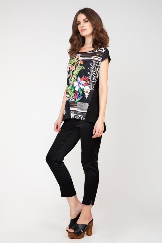 Топ без рукавов из эластичного джерси, эластана Tencel, с принтом спереди и черной спиной. Круглый вырез. Рукава слегка спущены по бокам. Передняя часть на 12 см короче передней и сужается к низу. Боковые швы начинаются ниже пройм и идут вниз. Закругленный край. Легкий А-силуэт. Длина для размера 38: 64 см/76 см спереди или сзади.