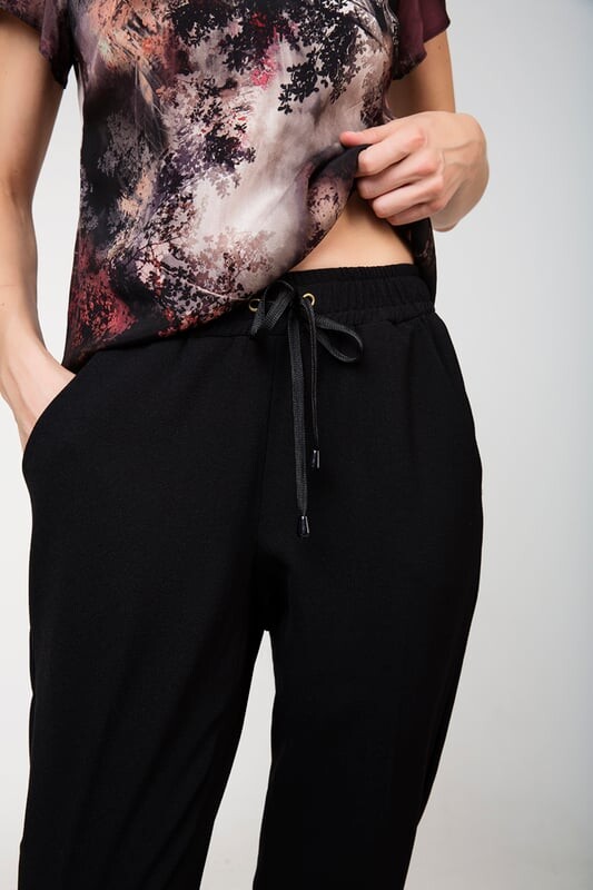 Тканые брюки с эластичной талией. Завязки на талии, продеваемые через две пуговицы на косточках на поясе. 2 боковых кармана. Широкий в бедрах и сужающийся к ногам. Длина 103 см для 36 размера.