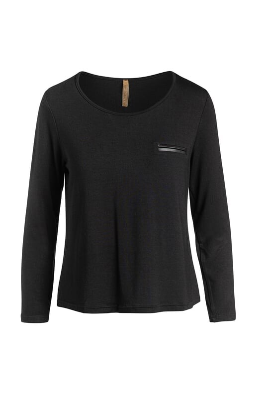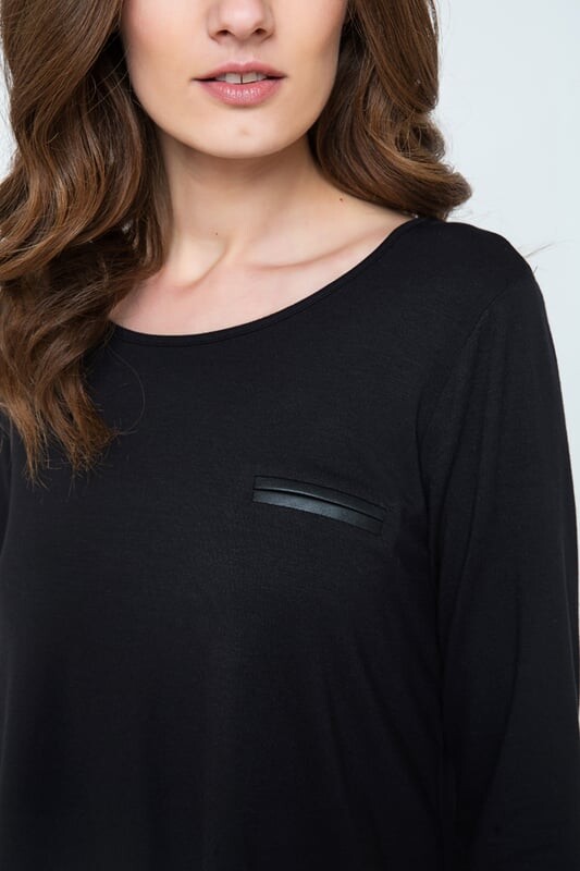 Топ с длинными рукавами из эластичного трикотажа. Округленный вырез горловины с отделкой из той же ткани. Декоративный карман на груди слева спереди с отделкой из искусственной кожи. Низ неровный, закругленный, сзади на 6 см длиннее. Горизонтальный шов по спинке на 28 см ниже плеч; складка ниже центра шва придает одежде легкий А-силуэт. Логотип «C» из черного кристалла слева внизу. Длина тела для 38 размера: 57 см спереди и 63 см сзади; Рост нашей модели 178 см, размер 36.