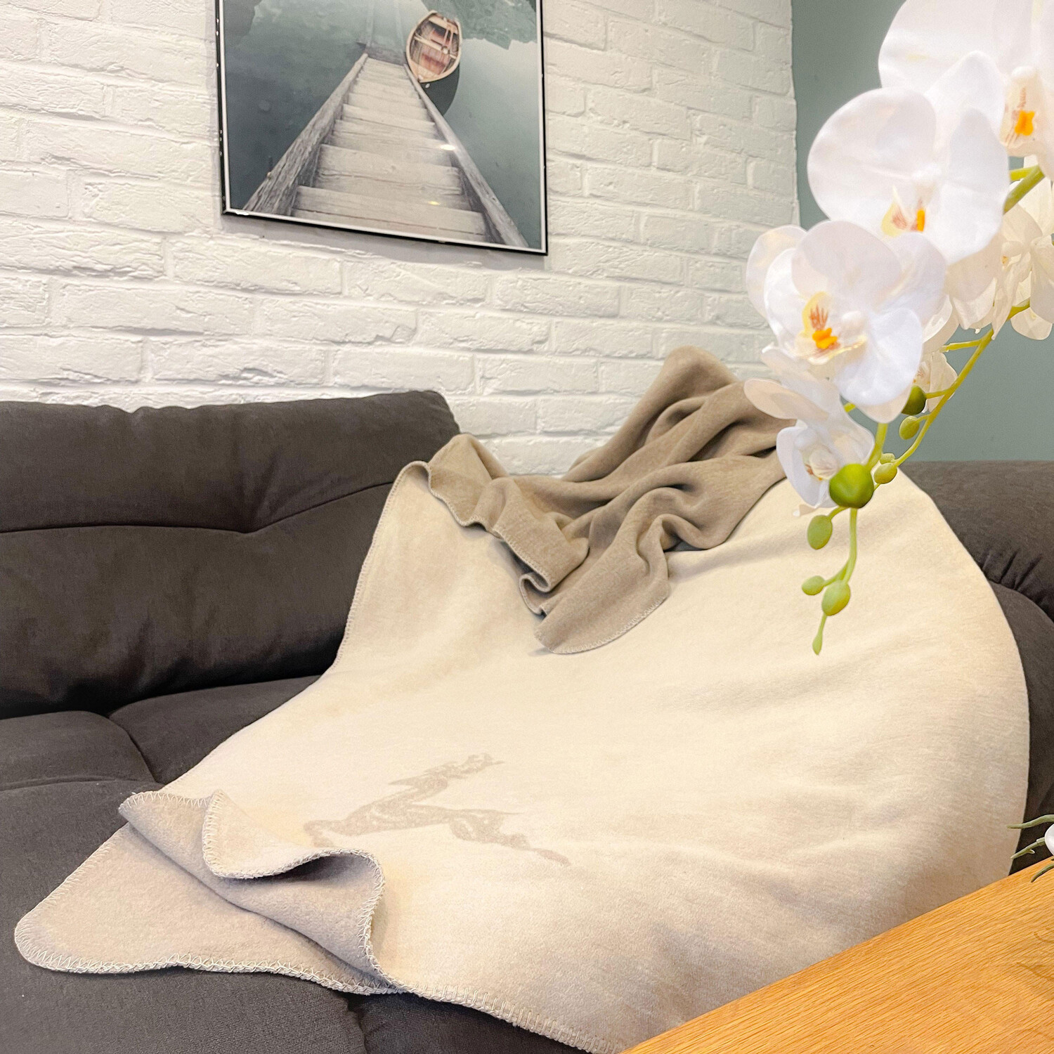 Расслабьтесь с этим уютным одеялом в кресле, на диване или на террасе. Одеяло также станет отличным подарком на Рождество, день рождения или новоселье. Оно понравится вам и вашим близким! Создайте приятную атмосферу в своем доме с помощью двустороннего одеяла двух разных однотонных цветов. Олень, плетущийся в нижнем углу, привлекает внимание. Одеяло размером 150x200 см сохраняет тепло и тепло всему телу. Одеяло изготовлено из двух разных материалов: 60% хлопка и 40% полиакрила, поэтому используются преимущества обоих. Это делает диванное одеяло чрезвычайно мягким, пушистым и прочным. Одеяло можно стирать в машине при температуре 40°C, а также сушить в стиральной машине.
