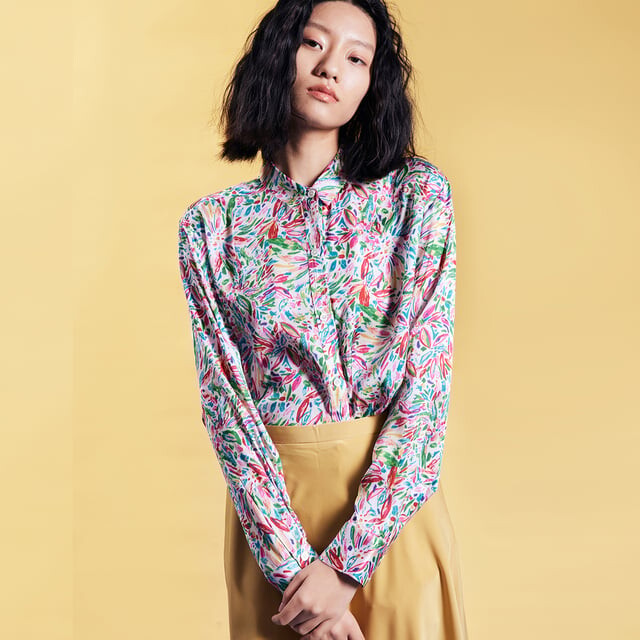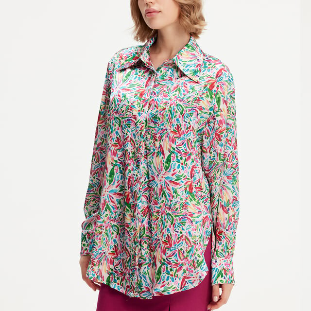 Простая и изысканная вещь с ярким летним принтом, которую можно легко сочетать с костюмами для формального образа или джинсами для повседневного образа. Широкий воротник в итальянском стиле добавляет образу индивидуальности. Подробная информация о товаре - Форма: прямая - Длина: 77 см - Итальянский воротник рубашки - Длинные рукава - Застегивается на пуговицы спереди по центру.