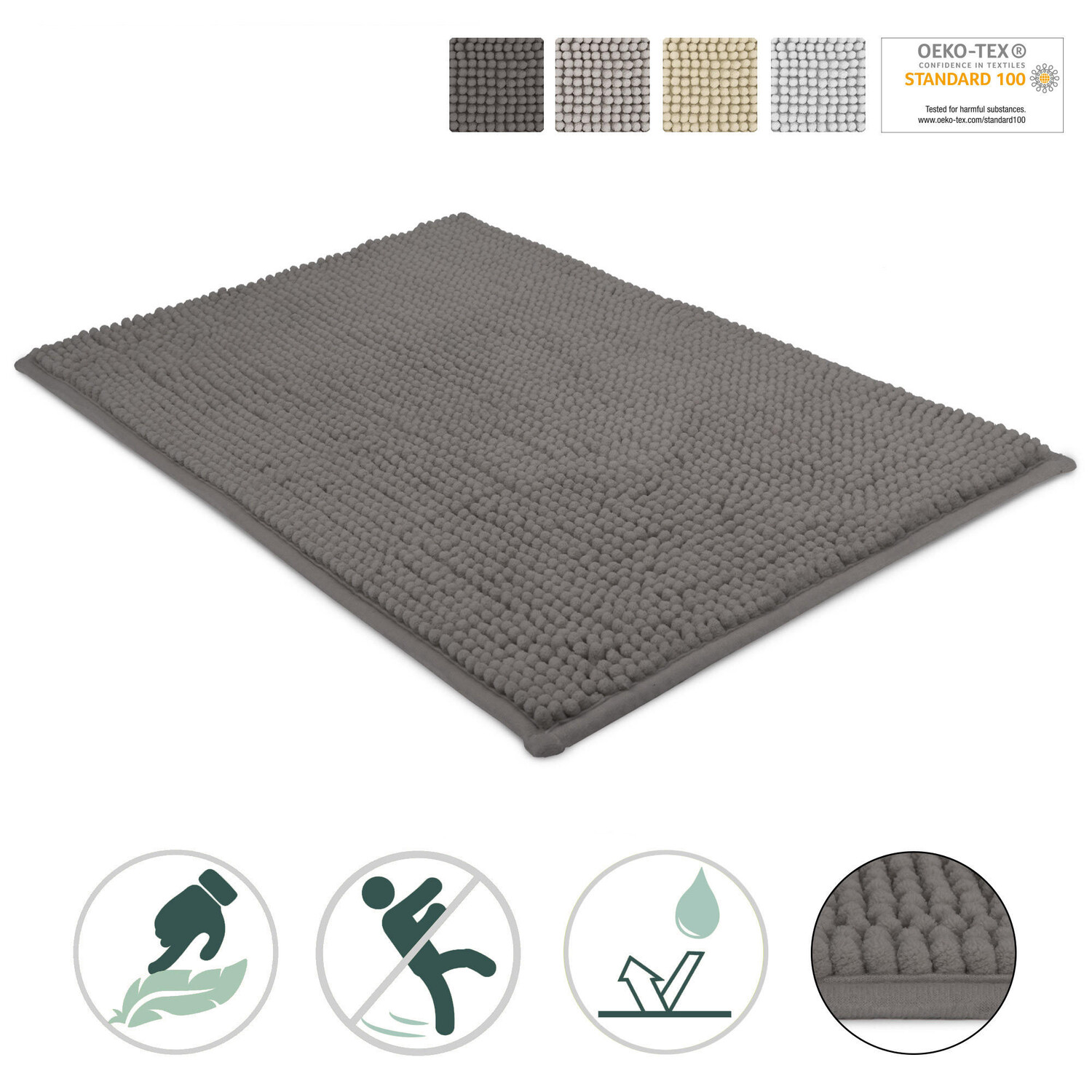 Нескользящий коврик для ванной Beautissu Коврик для ванной комнаты BeauMare WRУдобный коврик для ванной Beautissu имеет нескользящую изнанку, что означает, что вы можете без опасений наступать на коврик для ванной и в то же время надежно держать его. Таким образом, коврик для ванной идеально подходит для детей. Благодаря высоте 13 мм по нему очень удобно ходить. Кроме того, коврик для ванны можно без колебаний использовать даже при включенном подогреве пола. Можно стирать при 40 ° C. Коврик для ванны можно стирать при 40 ° C, и его можно использовать в душе, ванне в качестве коврика для ванной. В туалете, а также в других комнатах, например, в спальне или на кухне, в качестве коврового покрытия. Ваши мокрые ноги сразу почувствуют себя комфортно на очаровательном и удобном коврике для ванной, как после душа, так и после купания. Высококачественный коврик для ванной из синелиШенилл — это текстиль с вкраплениями. бархатистая поверхность. Ткань шенилл отличается особым качеством благодаря сложной технологии изготовления. К преимуществам ткани относится то, что она приятна для кожи, а также обладает теплоизоляционным эффектом. Ткань шенилл также особенно прочна и впитывает влагу.