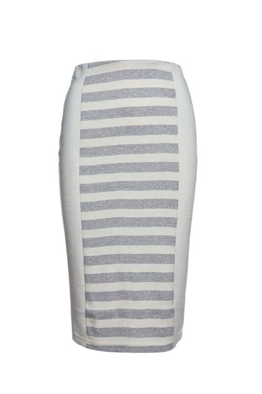 Юбка-карандаш в полоску цвета экрю и меланжа из эластичного материала. Широкие однотонные вертикальные вставки цвета экрю по бокам. Рост нашей модели 178 см, на ней 36 размер. Размеры для 38 размера (в см): длина тела - 67; Талия-32; Подол-39. Одежда приталенная.