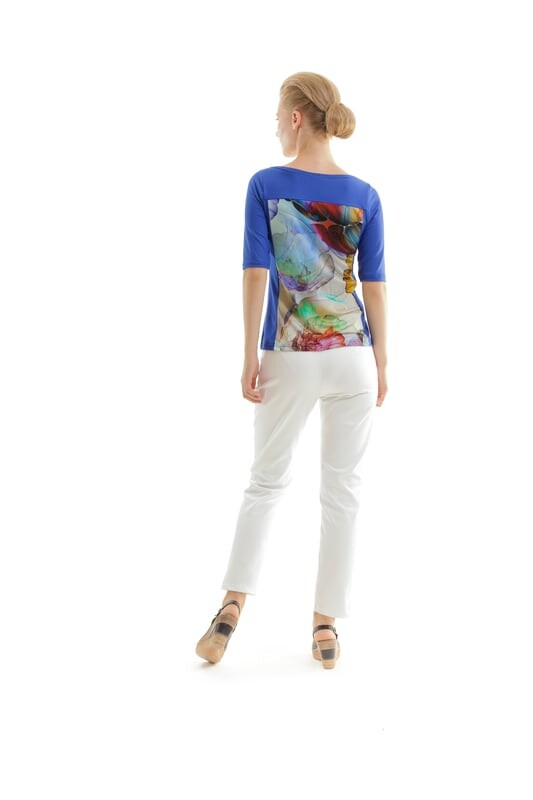 Топ с принтом из экологически чистого эластичного джерси. Рост нашей модели 176 см, размер 36/S. Сделано в Греции.