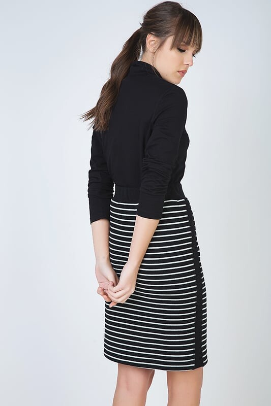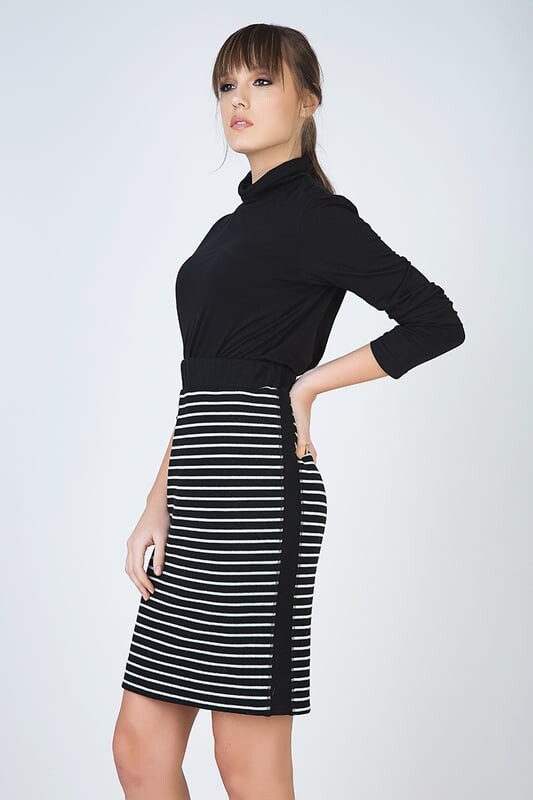 Полосатая приталенная юбка-карандаш из ребристого трикотажа. Пояс шириной 5 см выполнен из однотонного черного трикотажа. Боковые части черного цвета длиной 3 см из трикотажного полотна. Кормили. У нашей модели рост 178 см, на ней 36 размер. Замеры на 38 размер (в см): талия-34; Хем-46; Длина тела-59. Одежда приталенная.