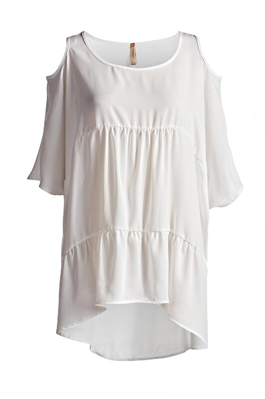 Верх CONQUISTA из полиэфирной ткани-жоржета. Открытие на плечах. Без рукавов, но за счет свободного кроя рукав ниспадает до локтя. Круглый вырез горловины с отделкой. Спереди два присборенных декоративных шва. Простая спинка без швов. Низ неровный, сзади длиннее. Туника силуэта. Длина для размера 36/S: 70 см спереди и 93 см сзади.