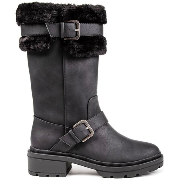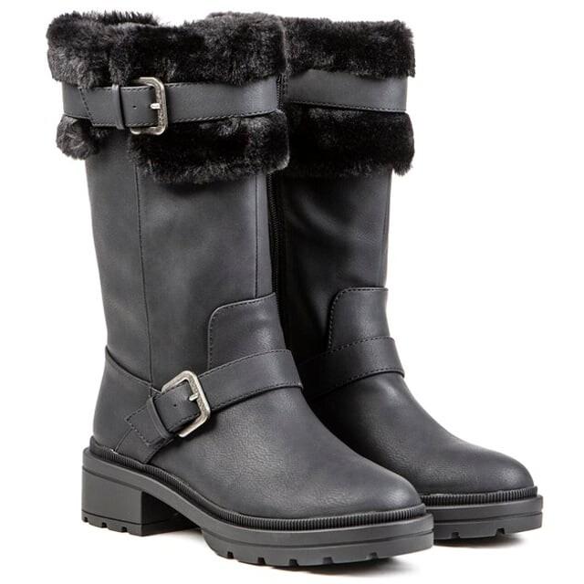 Ботинки до середины икры Black Rocket Dog Igloo с застежкой-молнией и синтетическим верхом с двойными эластичными ластовицами, внутренней молнией во всю длину, черной отделкой из искусственного меха и двойными декоративными ремешками с фирменной пряжкой на щиколотке и манжетах. Эти ботинки на теплой подкладке имеют фирменный блочный каблук и черную синтетическую подошву.