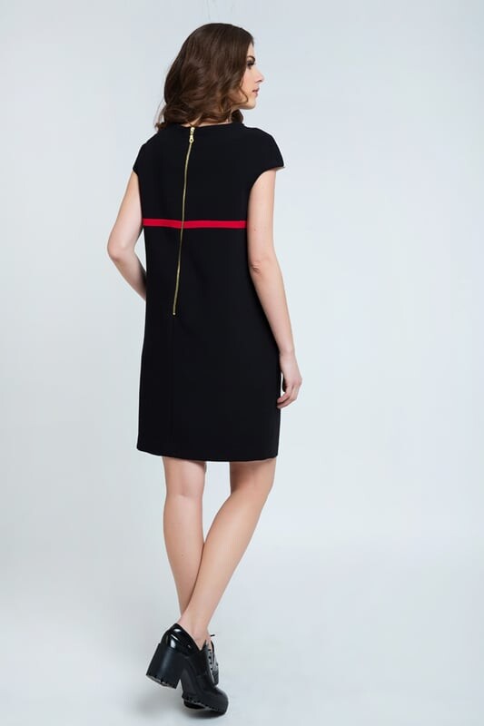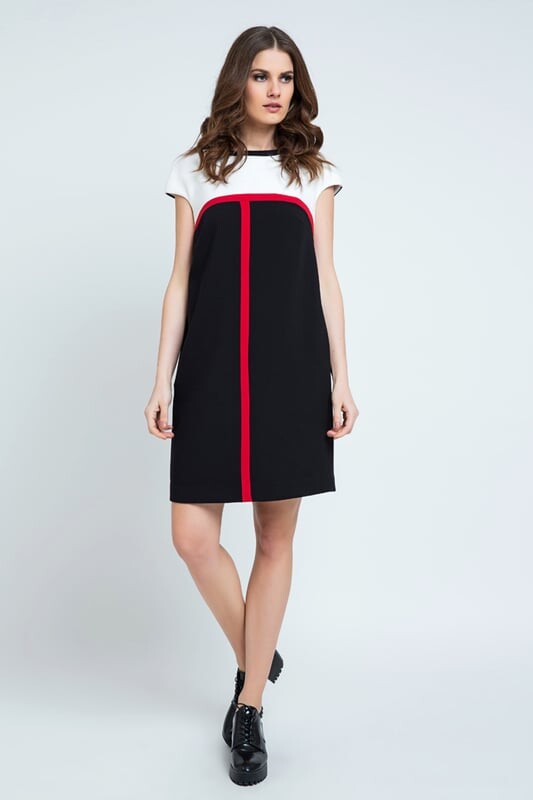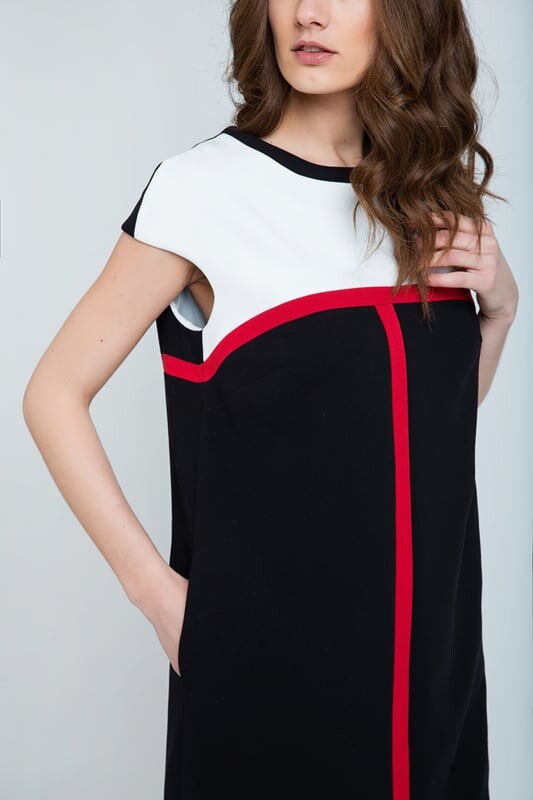 Зимнее платье без рукавов. Вырез круглый, с черной декоративной каймой на шее. Дизайн с цветными блоками: белый верх и черный низ. Контрастные красные полосы на теле. Молния золотистого цвета длиной 50 см сзади. Два внутренних кармана по бокам с контрастными красными вставками. Полностью на подкладке. Расслабленный силуэт мешка. Длина платья для 38 размера: 95 см. Дополнительная ткань по низу позволяет укоротить платье до 4 см.