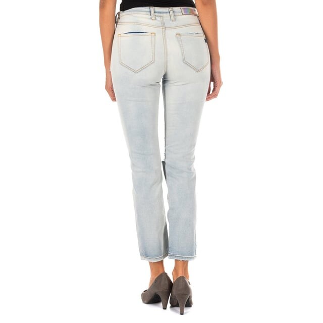 Длинные джинсовые брюки. Открытый эффект светло-голубого цвета. Молния и пуговицы спереди. Пояс с петлями для ремня. Два открытых кармана и мини-карман спереди. Сзади два открытых кармана. Нанесение пластиковой этикетки и названия бренда сбоку на поясе, на спине. Нижнюю часть отрежьте прямо. Видны швы в тон. Состав: 98% хлопок, 2% эластан. Рекомендации по стирке: - Стирать при температуре не выше 40 ºC. - Гладить при средней температуре, макс. 110°C. - Подходит для сушки в барабане. - Не используйте отбеливатель. - Не подходит для химической чистки.