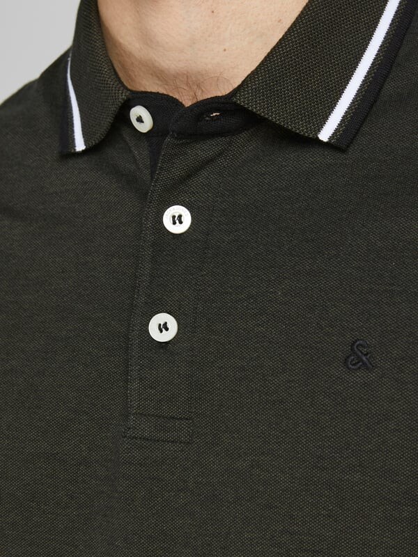 Рубашка-поло с классическим воротником и планкой на трех пуговицах. Воротник и рукава украшены контрастными полосками. На груди имеется небольшая бирка.