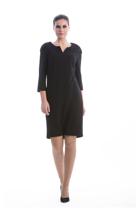 Платье CONQUISTA с рукавами ¾ и небольшим V-образным вырезом горловины. Искусственный мех на плечах и потайная молния сзади. Прямой силуэт, длина до колена. Подкладка из эластичного полиэстера. Рост модели 1,77 м, размер 36/S. 70%вискоза-25%нейлон-5%эластан+100%полиэстер